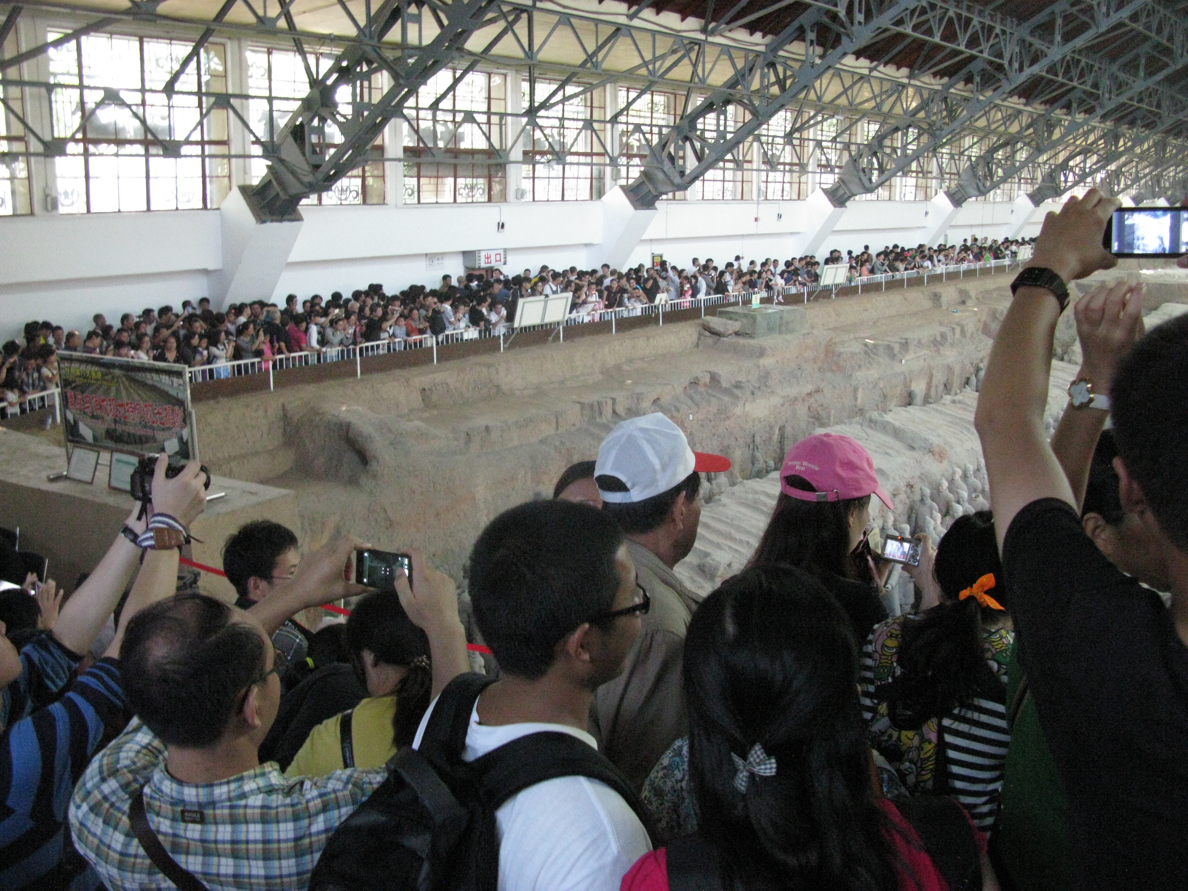 If we thought the crowds were huge in Beijing we had no idea what we were letting ourselves in for at Xi’an but the fact that the queue for the Public bus out to xxx to see the Terracotta Warriors snaked for hundreds of metres around the Railway Station Car Park should have been a sufficient warning! We commandeered a taxi for the 50km or so journey to Bingmayong and got out in an hour but the return journey took almost 3 hours as traffic back to Xi’an moved at a snail’s pace. On a normal day up to 40,000 can visit the Terracotta Warriors but when we were there the crowds were the densest we saw in China with groups six or seven deep jostling to get next to the railings to pier down into the archaeological pits. I accept we were there on one of the busiest days of the year so my experience hardly typical or objective but I won’t be returning – there are more accessible and user friendly attractions in China as far as I am concerned.