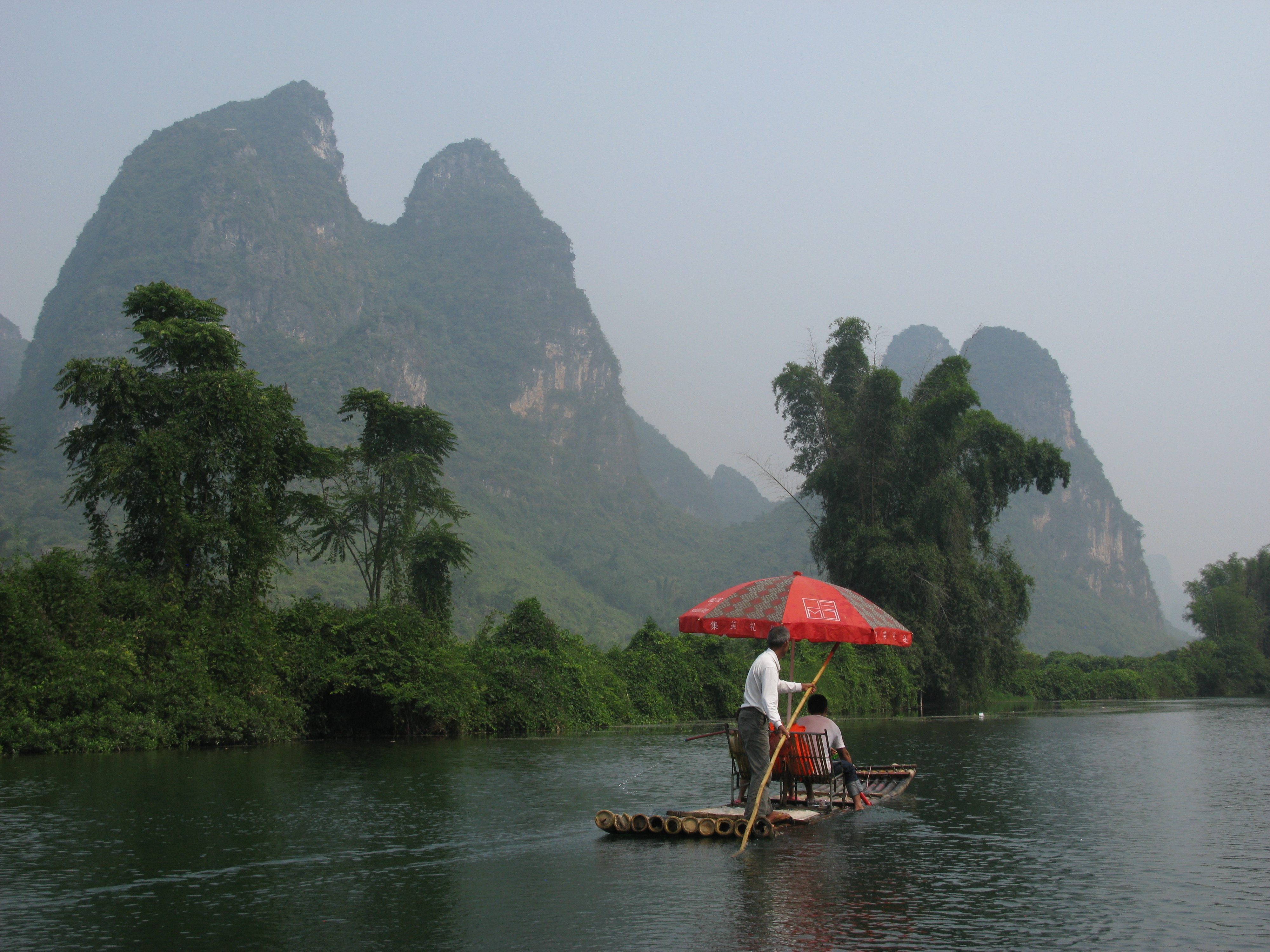 We have ended up on the Li River in southern China. As a Geographer I am always attracted to landscapes and this is the region of very distinctive Limestone towers and pinnacles that feature prominently in every poster and travel book about China.. We took a River Boat from Guilin to Yangshou together with maybe another 50 or 60 boats and hundreds of small bamboo rafts ferrying tourists through a never ending series of beautiful vistas including one that adorns the 20 Yuan note! Even though it was misty and hazy it was still very attractive as the haze gave the views an almost mystical or ethereal quality.