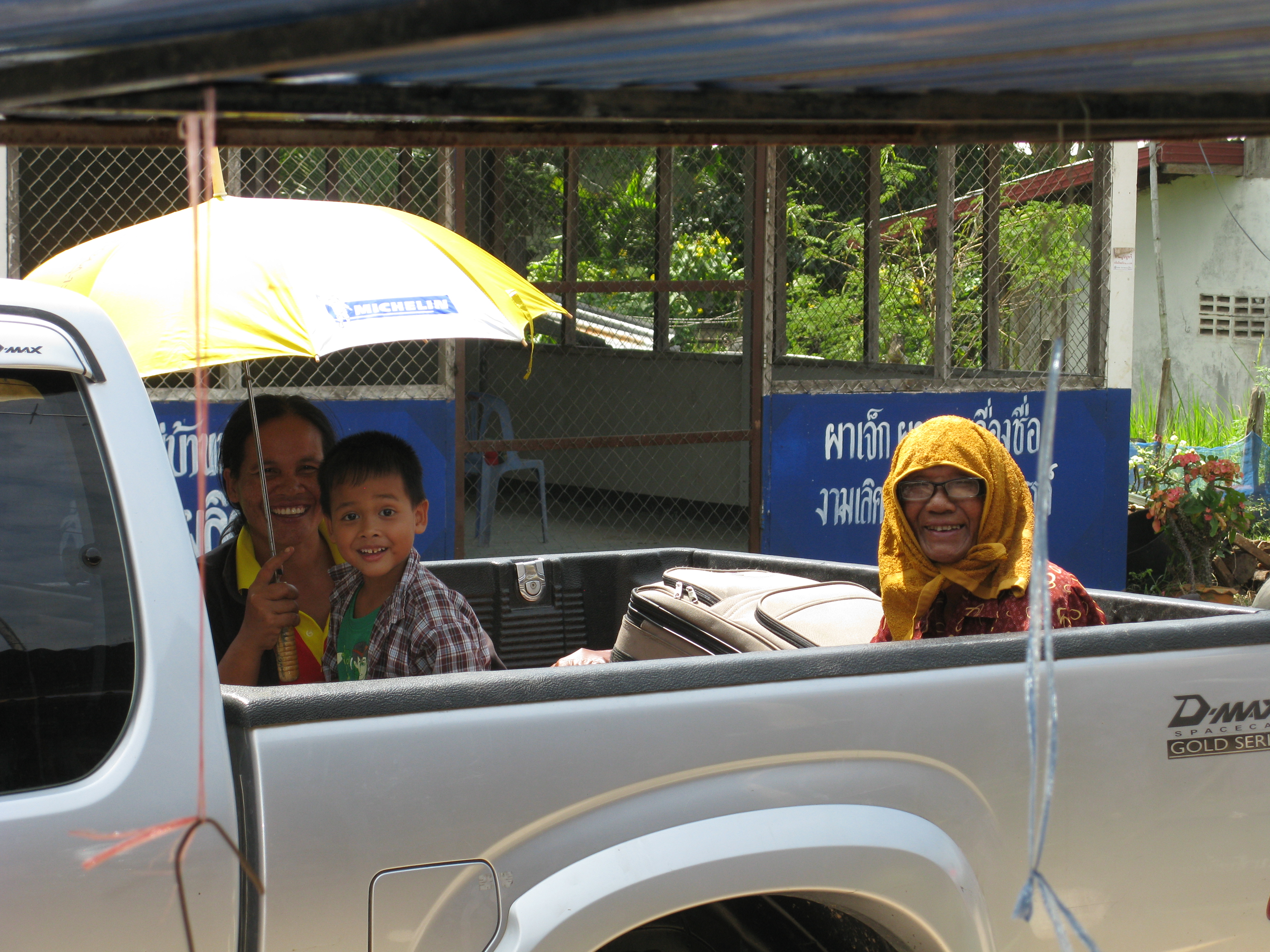 Somehow we squeezed six in the cab (the driver, Ampai to navigate, Chouan, Boy, Chai and the honoured foreign guest who we have to keep happy – after all he’s paying!) and the other six sorted themselves out in the back around my case.