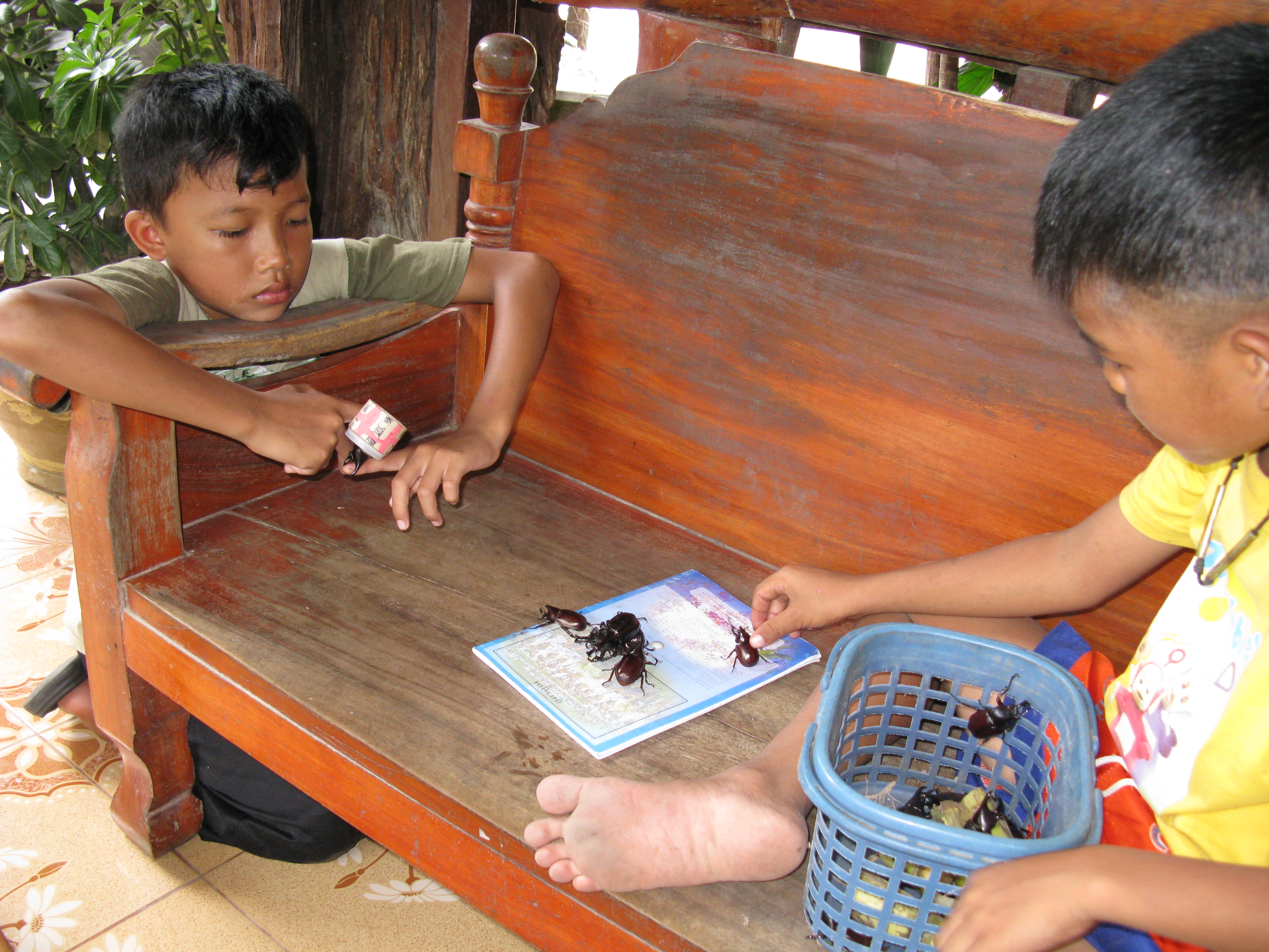 The kids are on holiday and Baumi and Chai keep appearing with these giant bugs which look like a cross between a cockroach and a scorpion with big pincers. They keep about 10 in a box and take great delight in opening their pincers, clamping them around each other in clumps of three and four and set them off on each other in a Thai Superbug version of extreme fighting! I never realised that such small bugs could make so much noise, hissing and spitting nor how strong they are to survive being pulled apart by a 7-year-old kid with their claws wrapped around each other. And once they detangle themselves the kids put them back together for another round of action. Cruel? Well it fills the time until the bugs are fried for dinner!