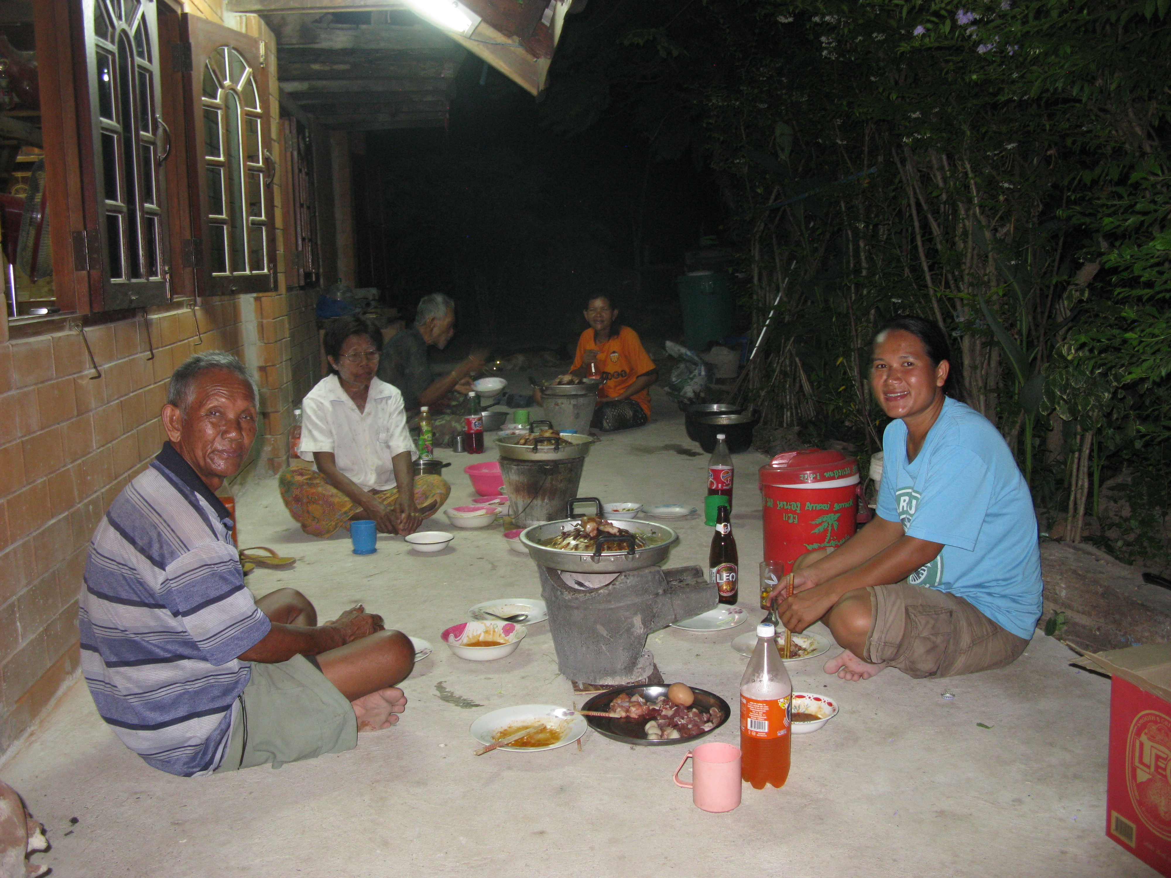 I think it was because everyone was so happy with what they had and just to be eating together. I noticed that Ampai’s Mother was not present and was told she had stayed in her house next door to watch TV as she would struggle with the barbecued chicken without any teeth. The family and myself have offered to buy her dentures but she has always refused..I found it difficult to understand that a mother would not walk 15 paces to join the family gathering even if just to squat on the floor and have a drink but Ampai said ‘It is not important – she likes to watch TV’ and it was true – this family will do anything to help each other and are comfortable in their own skin. Me? I would be only too quick to take offence if my mother aged 95 chose to stay home rather than go out for dinner with us. (‘For Heaven’s sake Mum – don’t use age as an excuse. You might not be with us next year’ And sadly she’s not)