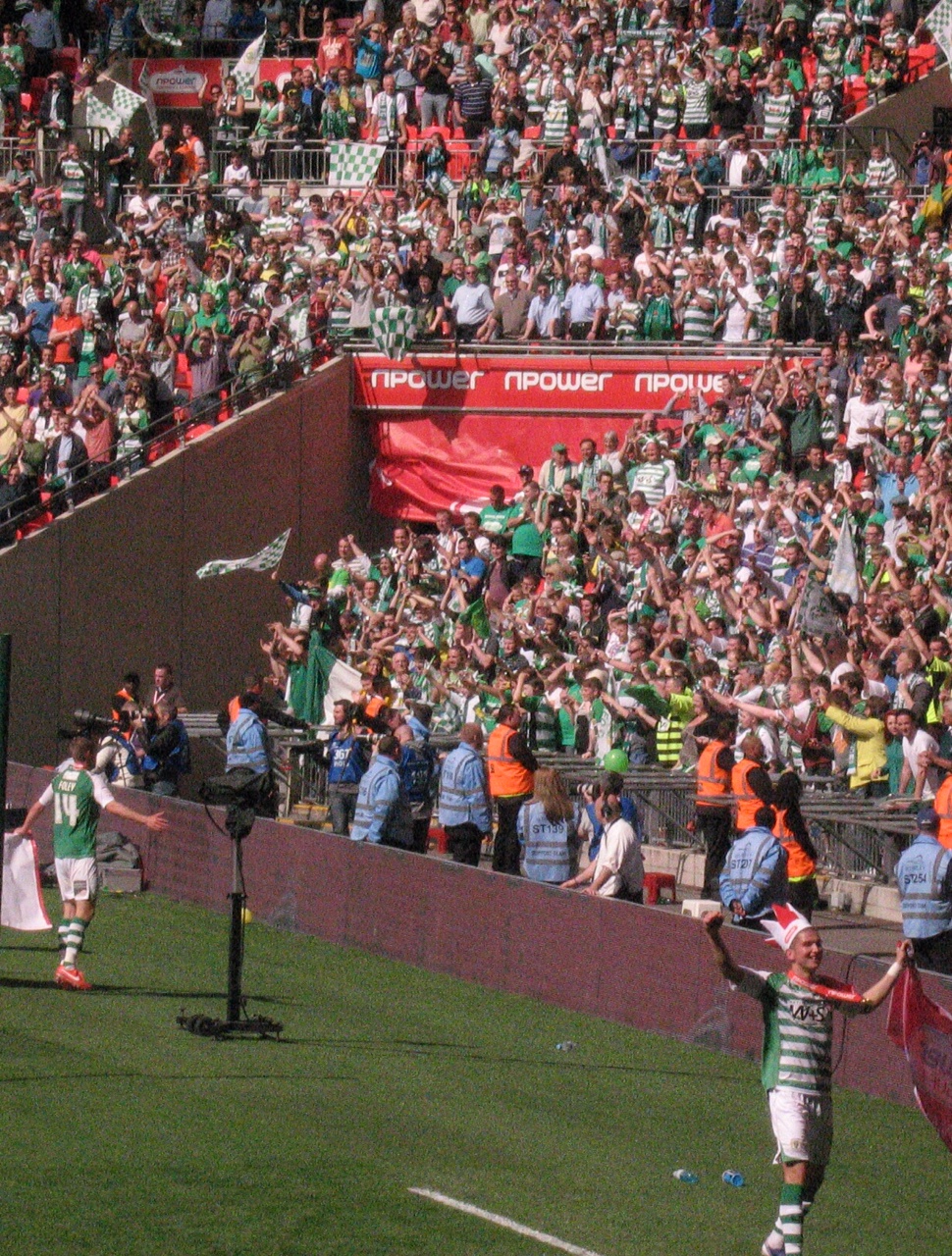 I always feel that the new Wembley is much more impressive inside than outside and we enjoyed the preliminaries together with almost 30,000 Yeovil supporters almost all bedecked in green and white at our end of the stadium and as we all prepared for the kickoff I thought to myself ‘We have a real chance of winning this and going up’ and once the game started my thoughts were soon vindicated when Paddy Madden ended his 5 game goalless drought with a goal of exquisite quality after just 6 minutes. The ball broke to him fortuitously outside the penalty area and on full stretch he caressed the ball first touch with the outside of his toes into the top left corner of the goal. It was a goal that had class written all over it and would have been outstanding if scored by Lionel Messi himself and it underlined the blindingly obvious – the man is a natural goal scorer and destined for a big future. Yeovil were well on top and although Brentford started to come back into the game a second Yeovil goal from a Dan Burn header following a corner just before half time meant that we went into half time with a two goal advantage. We all initially thought James Hayter had got a touch on the ball but it was Burn’s goal for sure.
