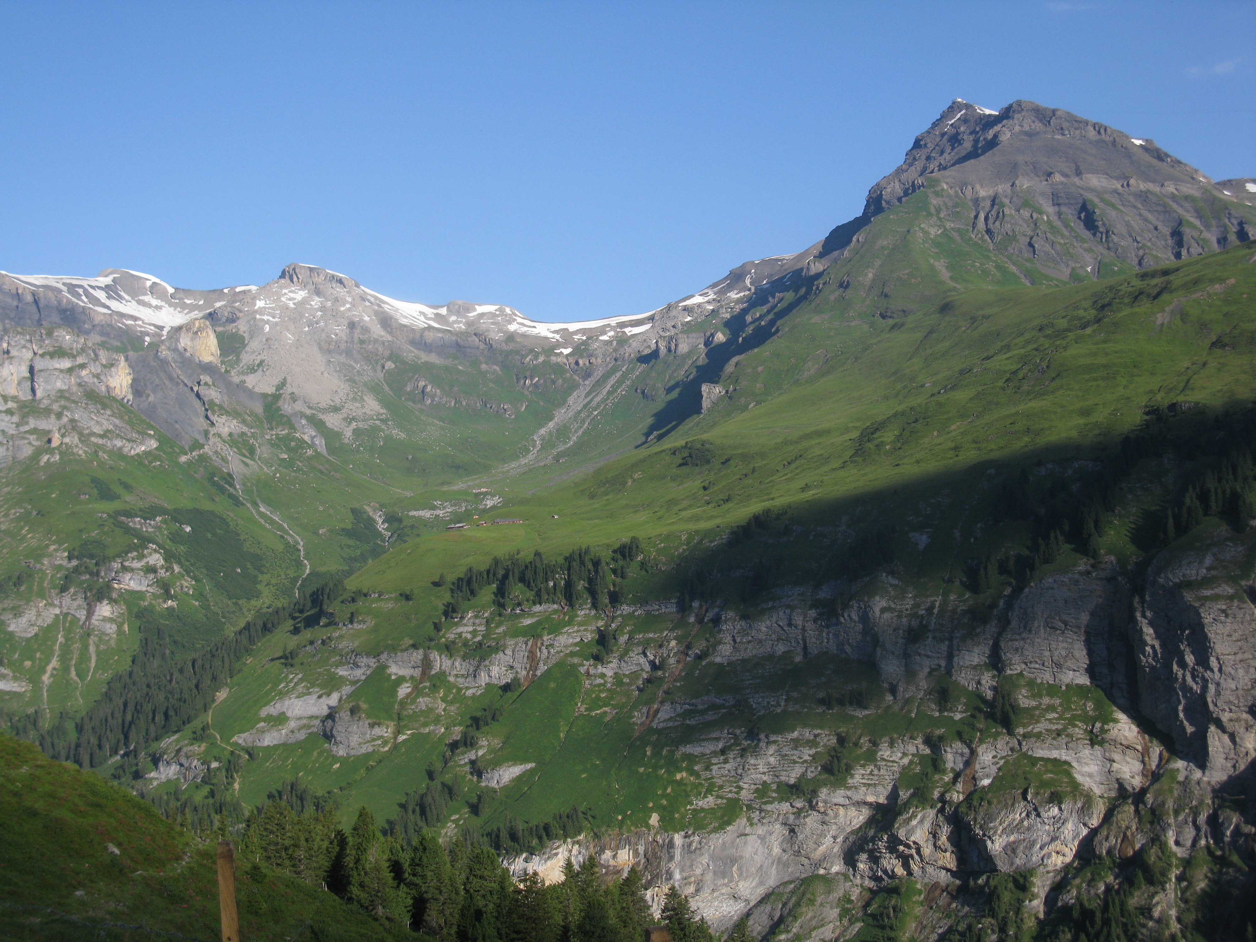 The cowshed at Busenalp is clearly above the tree line on the right side of the dark middle distance ridge. This picture was taken from the writer’s home in Murren.