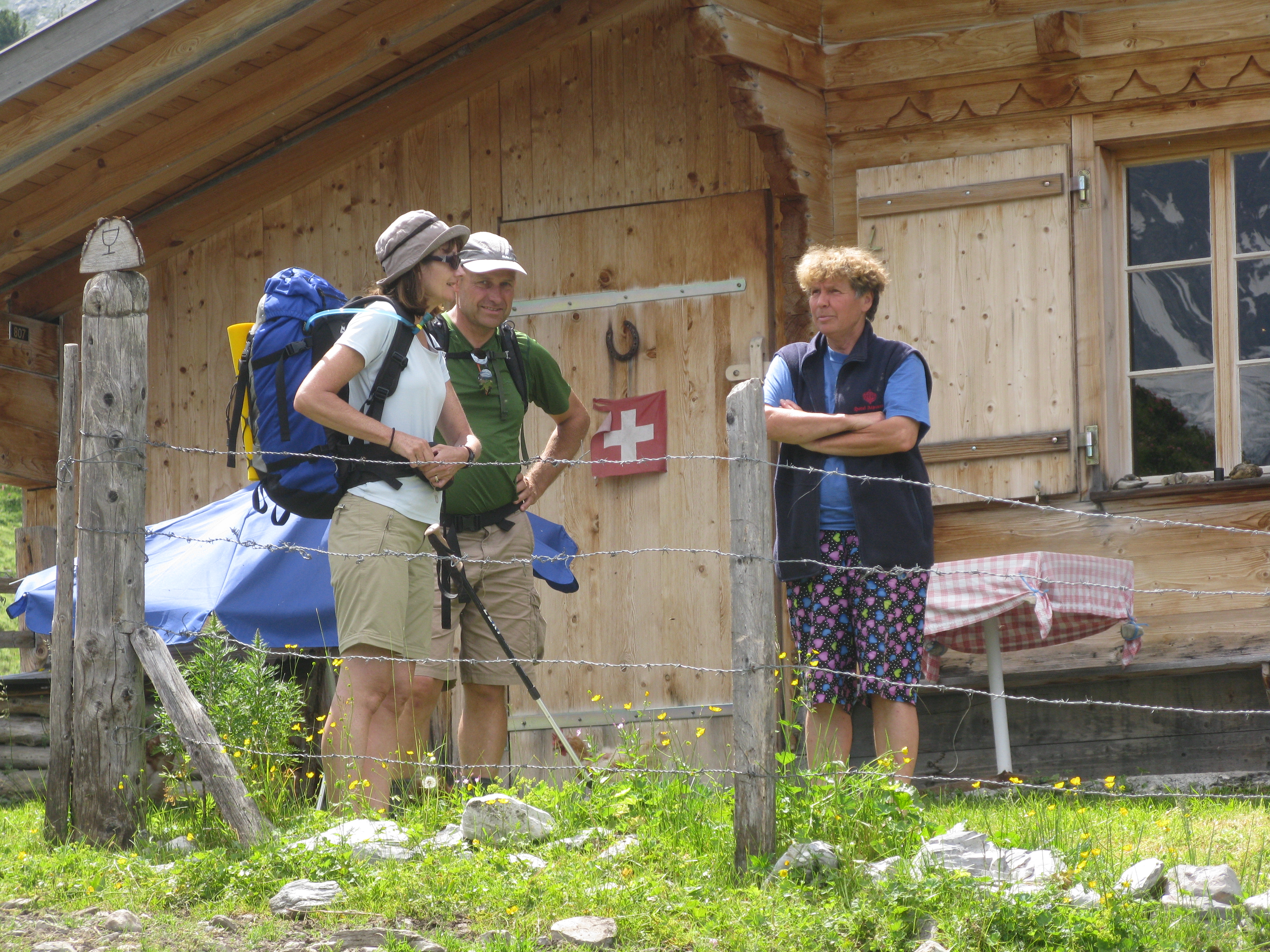Together with my friends Steve and Eileen we had walked seven hours from the Gspaltenhorn Hut, over the Sefinenfurgge Pass at 2400 metres/8000 feet, descending 1100 metres or almost 4000 feet into the Sefinental Valley before a final unrelenting climb to the rarely visited but spectacularly located alp at Busenalp where Sylvia stays alone for around 10 weeks every summer looking after about 50 cattle.