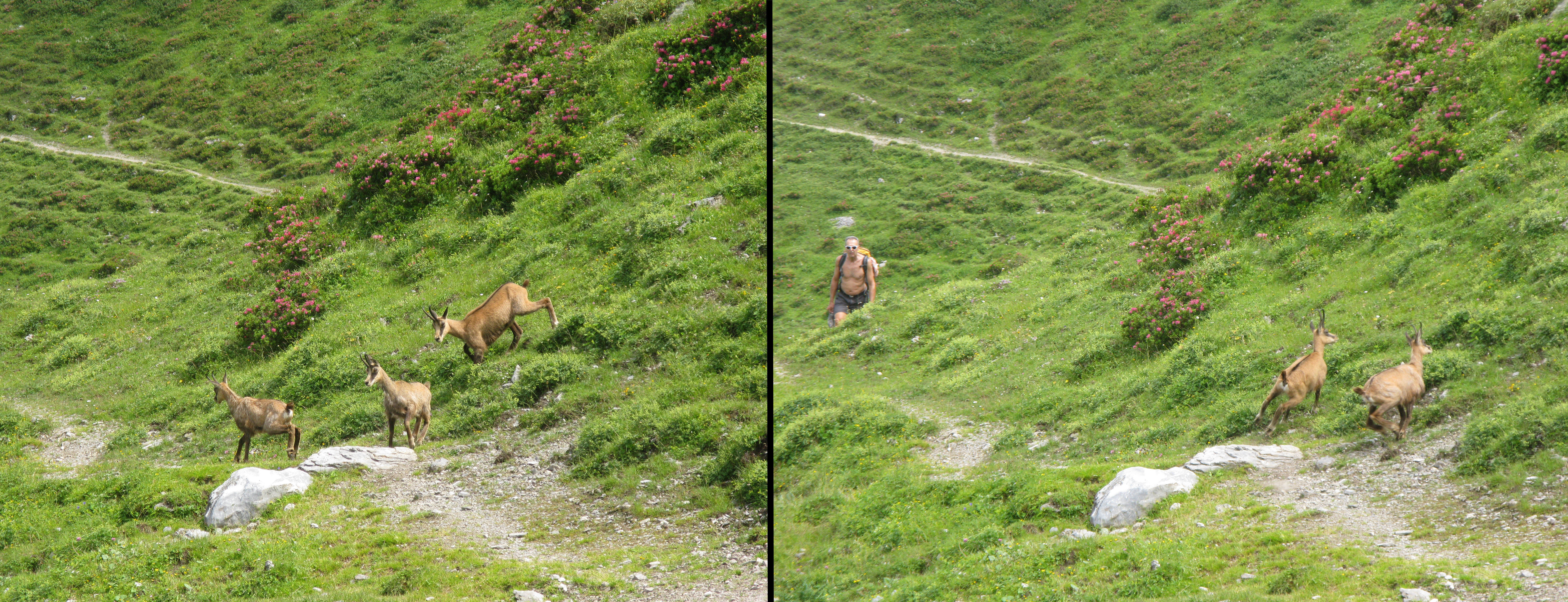 We amused ourselves at lunch watching the chamois (wild deer) cautiously approach the hut area as they liked to get down to the rocks near the water trough and lick the salt off the surface of the rocks. It was a glorious day and there were obviously a number of day hikers making their way between Obersteinberg and the Sefinental Valley and some were diverting to Busenalp for a coffee or beer. On two occasions the chamois had slowly and cautiously approached the trail that they had to cross to get to the rocks only to coincide with a hiker approaching and the chamois rapidly scattered with great agility across the hillside to try again 20 minutes later.