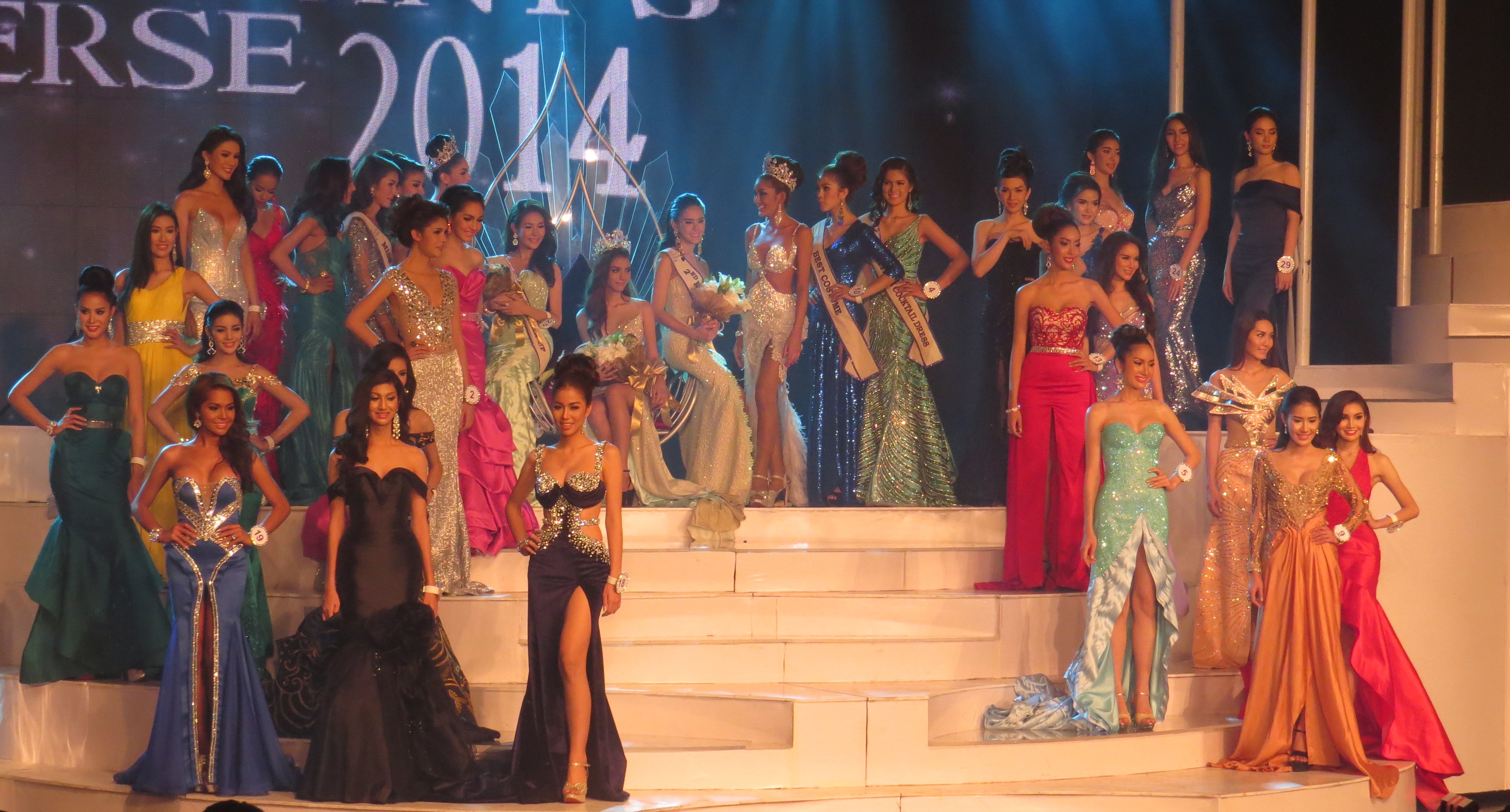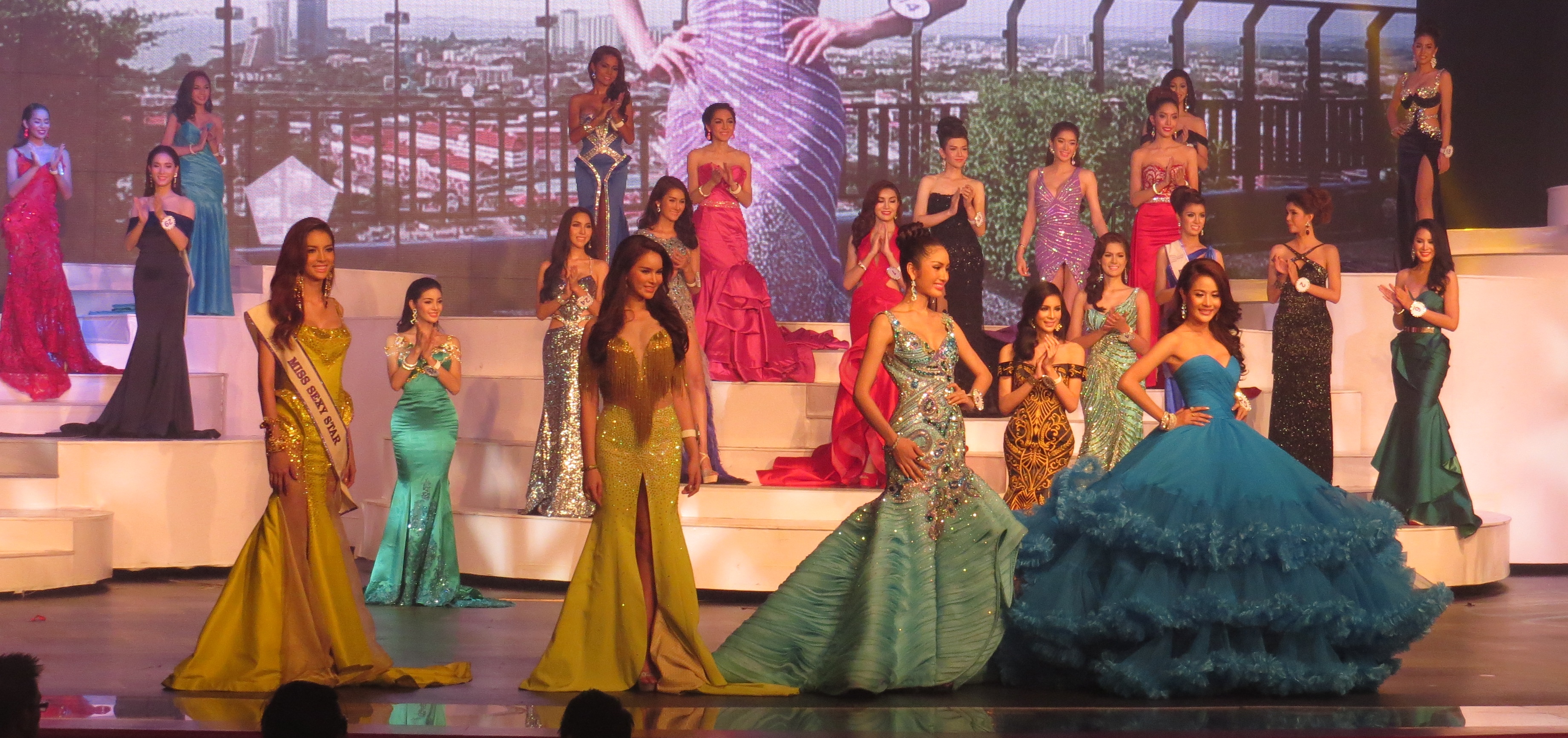 And then the show finally began with a nicely choreographed opening number featuring all 30 contestants in their cocktail dresses followed by the two comperes coming on stage. I have to say as I gazed at the 30 contestants posing at the end of the number  that they  looked magnificent! As this was being broadcast live on one of Thailand’s innumerable TV channels I soon discovered that just like an American NFL game there were lots of pauses for the advertisement breaks.