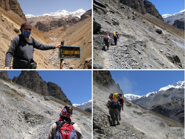The trail was well marked and clearly followed the south side of the valley and I just followed Dendi and Ampai who in turn were following another two small groups of trekkers who we could see making their way up the well marked trail along the side of the dry valley side. I stopped to have my photo taken next to the sign that announced ‘Landslide Area’ and did not give a great deal of thought to how the dead Yak at the bottom of the slope got there. Nor why the group up ahead seemed to have stopped for a while before continuing.