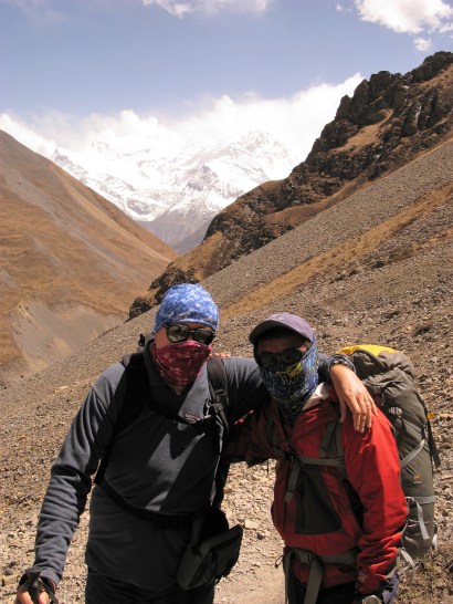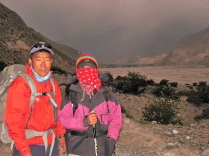 Our 2009 Annapurna Trek went well although given Dendi and Ampai were almost 30 years younger than me it was not surprising. I was the slowest but it was not a race and the others pretty much walked at my pace. The crux of the walk was crossing the Thorong La (Pass) (5416m/17,769ft) and the day before which was the 9th day of our hike we were making our way up a narrow dry and dusty valley heading towards the last tea houses before the Pass at Thorong Phedi where we planned to spend the night.