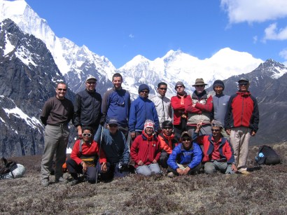 Our 2006 Trekking and Climbing group with Dendi in the front row and Everest (right) and Lhotse (left) either side of the South Col behind.April 2006