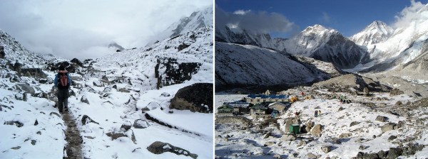 After a full and demanding day’s walking we were both happy to have reached the flat alluvial plain formed by deposits from streams flowing down off Pumori which told us we only had a few hundred metres to go to reach our (relatively) warm lodge at Gorak Shep when Lisa said ‘Look theres Dendi’ as we saw a lone person walking towards us from Gorak Shep.