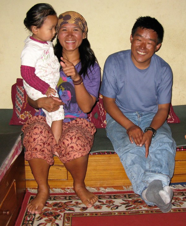 Dendi in his Kathmandu home and a local restaurant with wife Ang Doma, daughter Tshiring and son Kunjang. May 2009