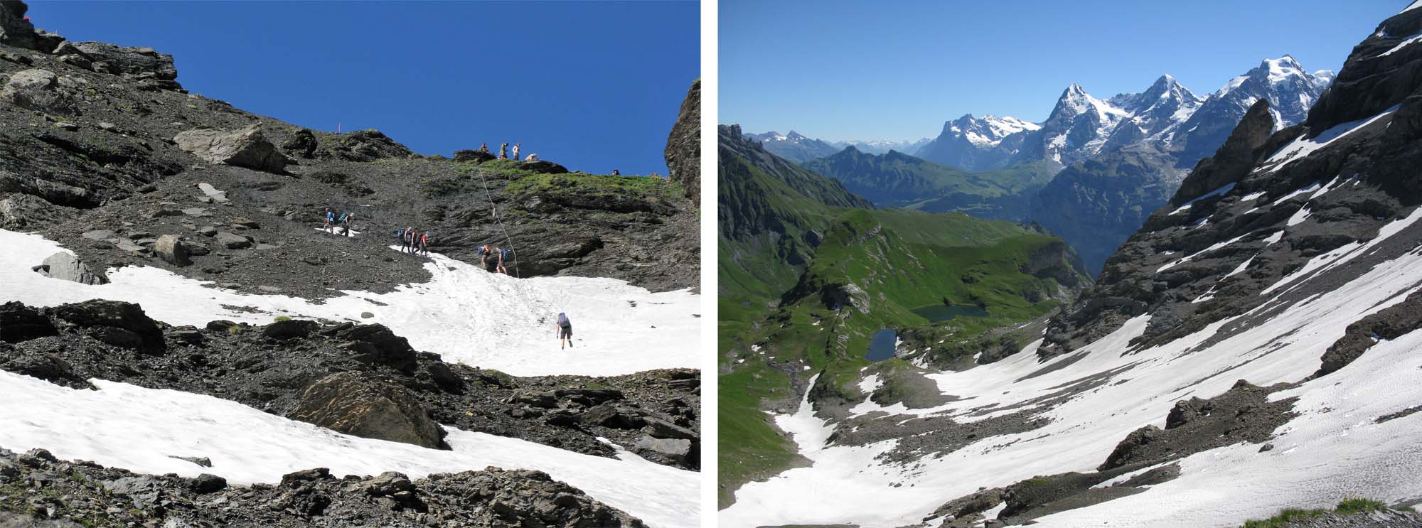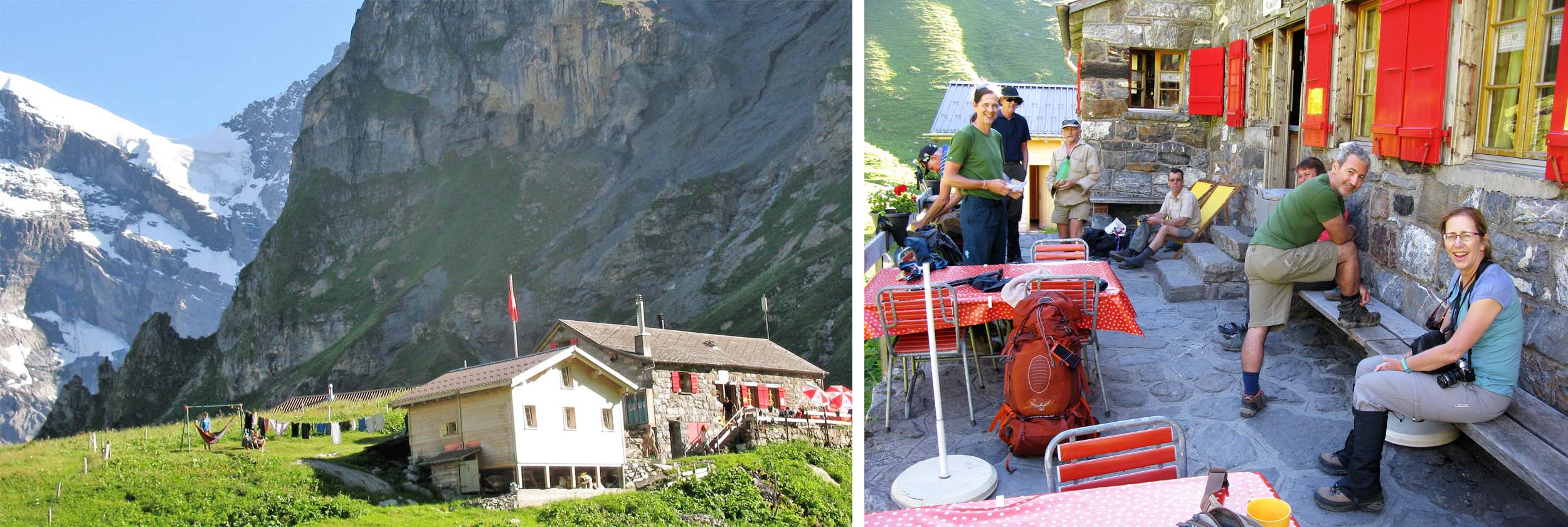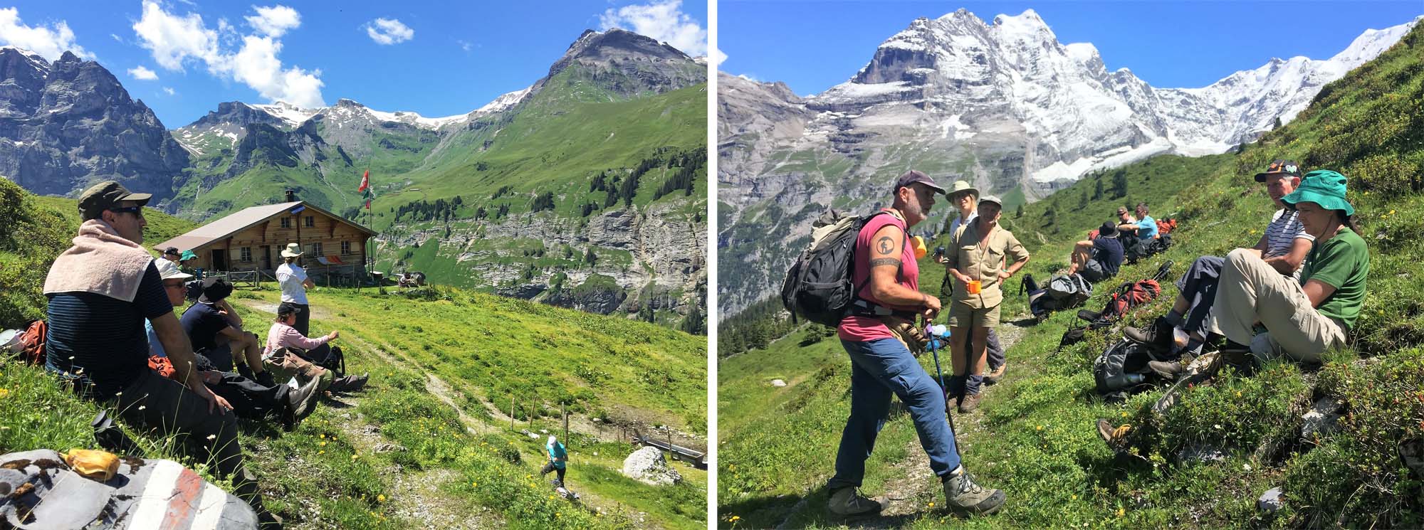 Lunch break at Busenalp with the Schilthorn on the right of the left image, and the Jungfrau (centre) and the Ebnefluh (right) prominent in the right image.