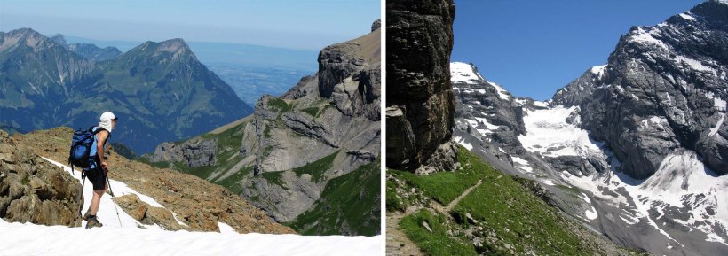 The next day it was dispiriting but necessary to descend and cross some rough terrain before a steep two hour 700m climb to the Hohturli Pass and the nearby Blumisalp Hut with tremendous views of the Blumisalp group together with nearby Glaciers just below the hut.