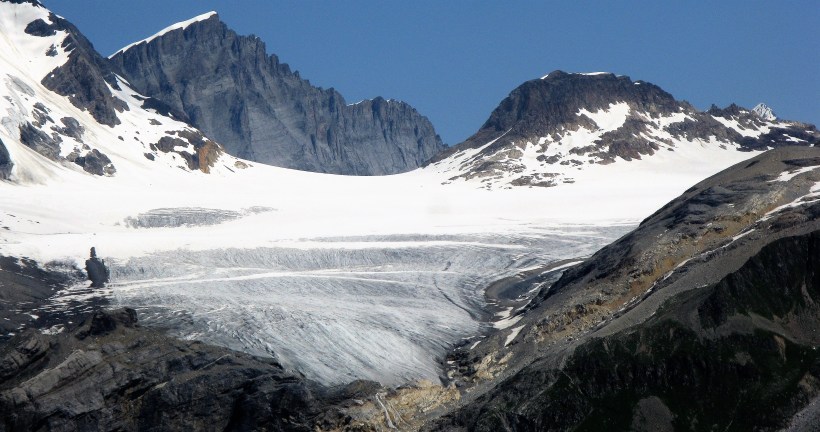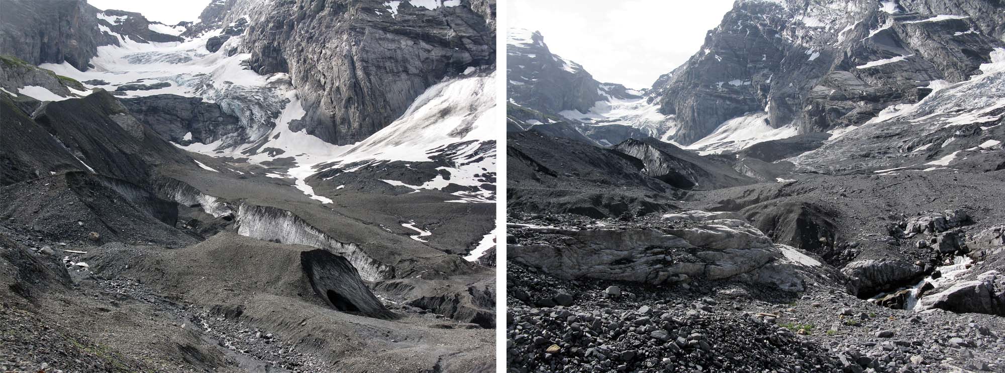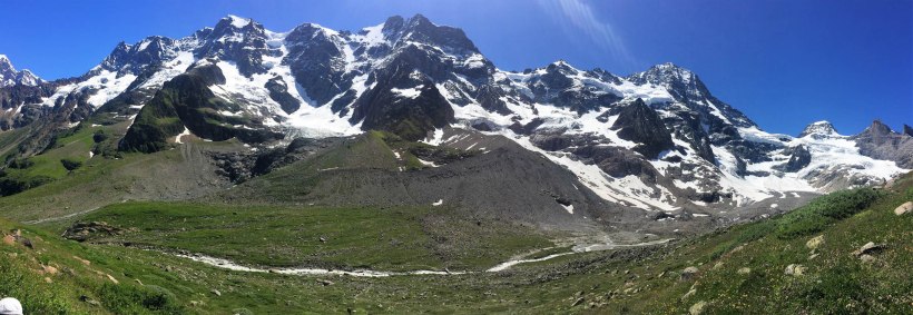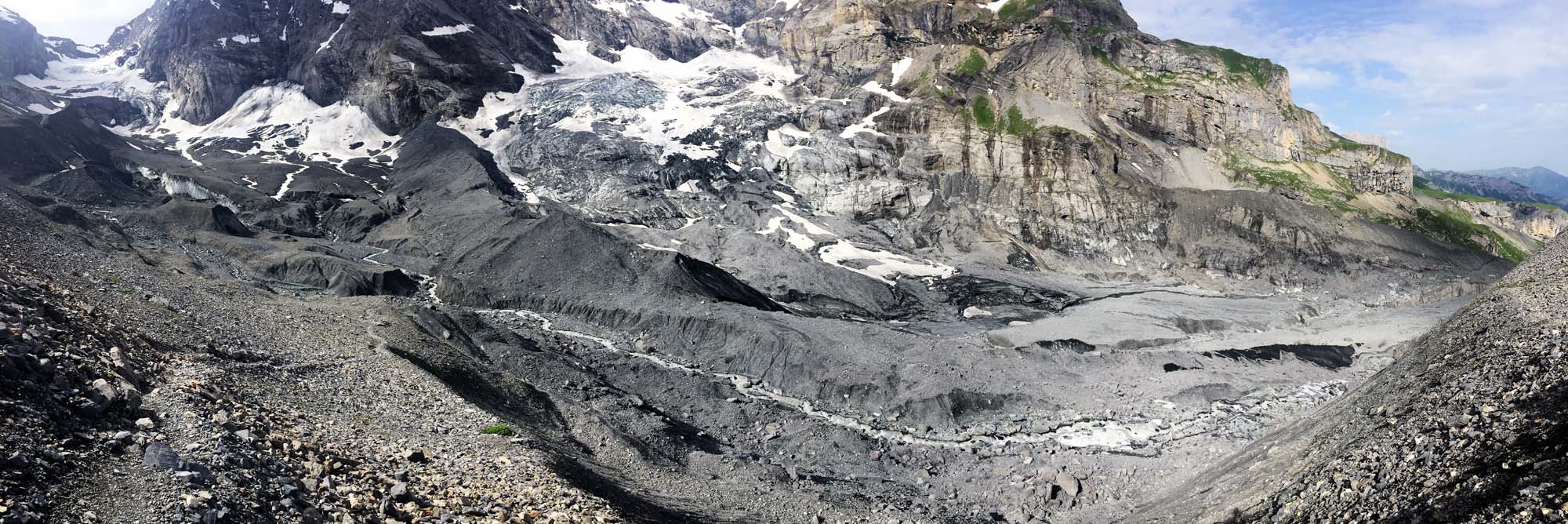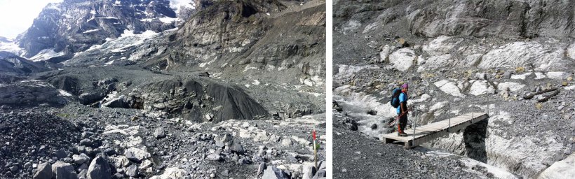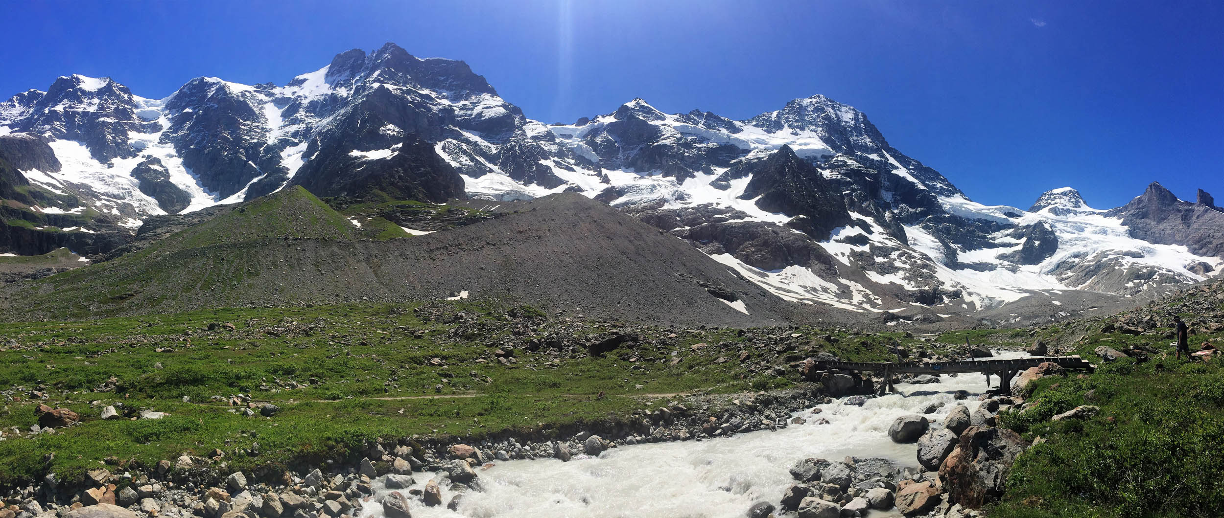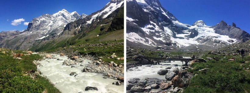 Looking towards the Schmadri Hut which is located dead centre on a grassy ridge surrounded by a crescent moraine. The stream is emerging from the rubble covered Breithorn Glacier on the right.