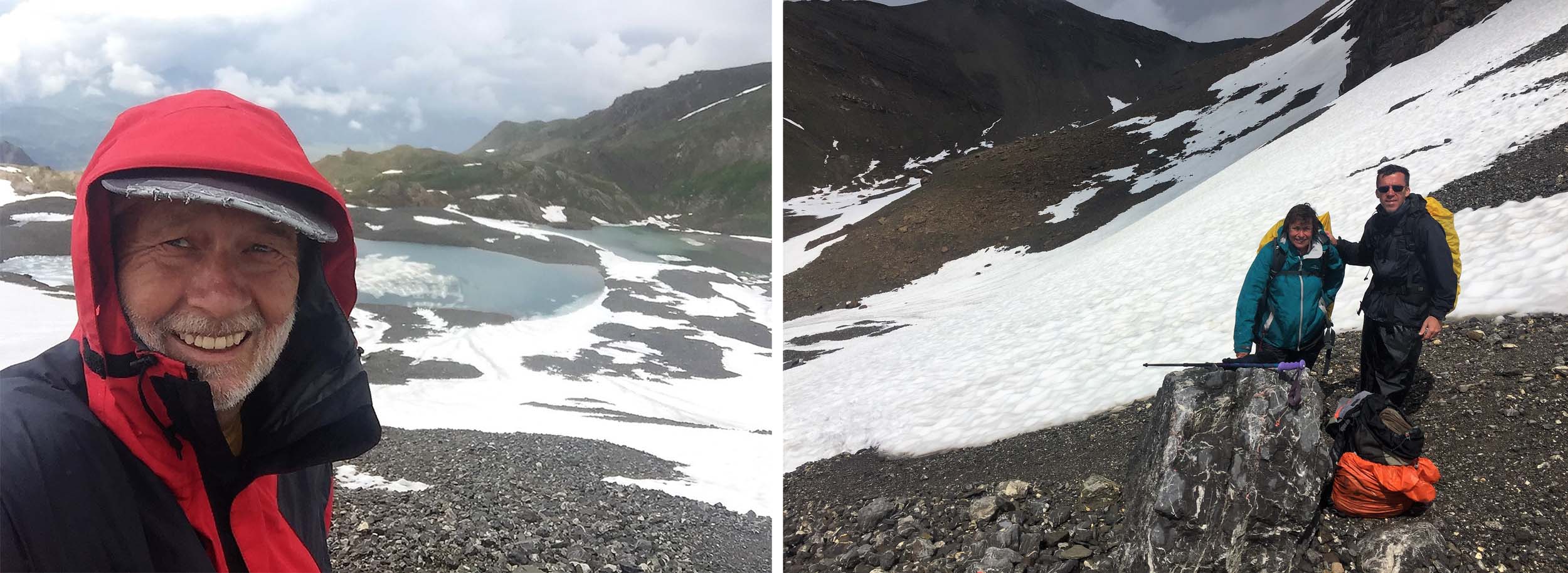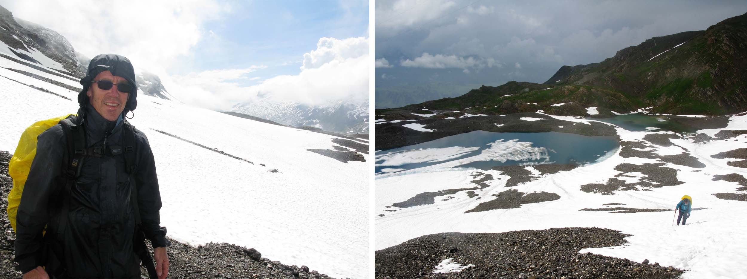 We took the Postbus from Lenk to Iffigenalp as we had nothing to gain by walking 10km along a valley trail that followed the road and we wanted to put all our efforts into the steep 1200m climb to the Wildstrubel Hut which was really the crux of our 15-day walk. Unfortunately most of us were still on the trail and close to the snow and ice covered Rawilseeleni Lakes when the weather suddenly worsened and we were hit with 50 minutes of heavy rain and hail. I was soaked before I could open my pack and get my wet weather gear out!