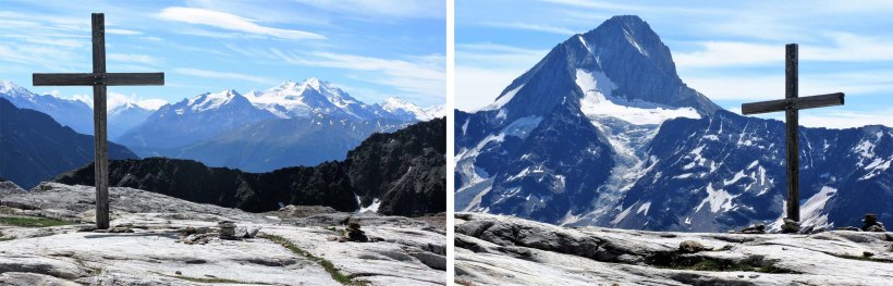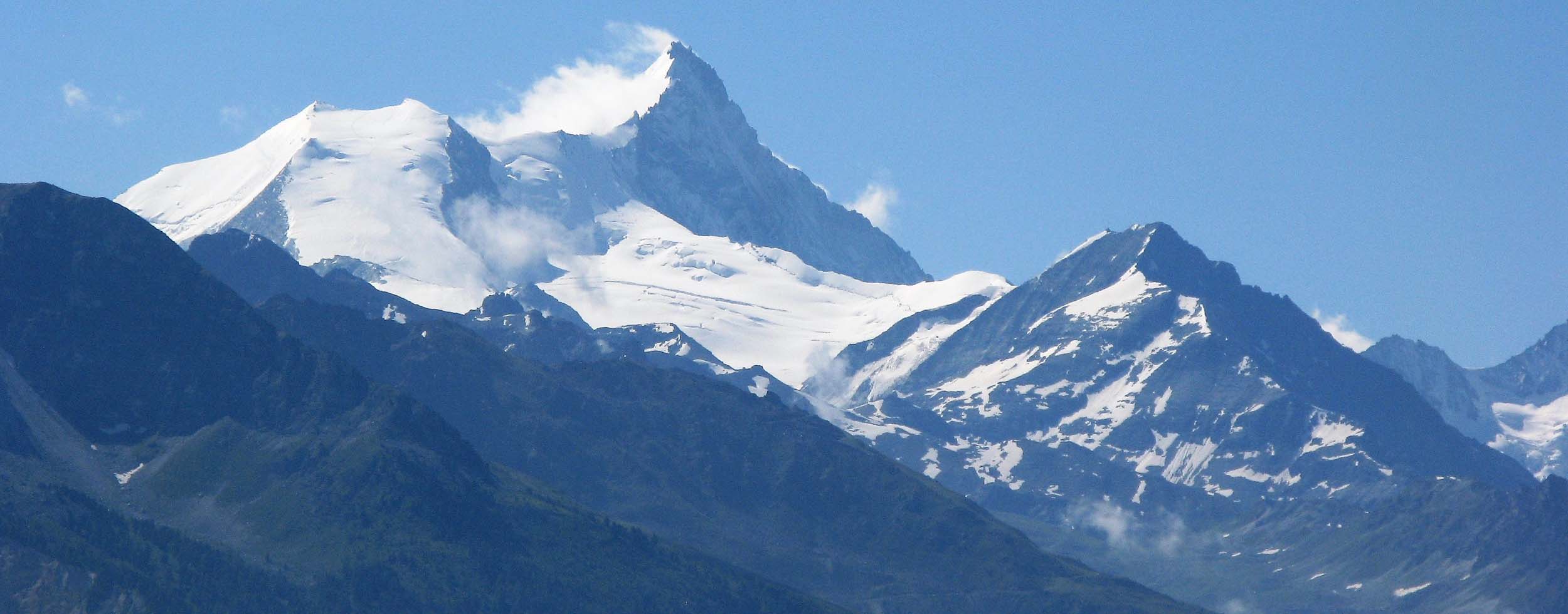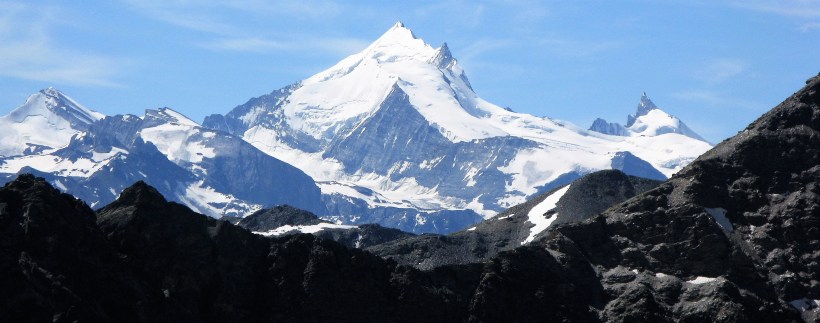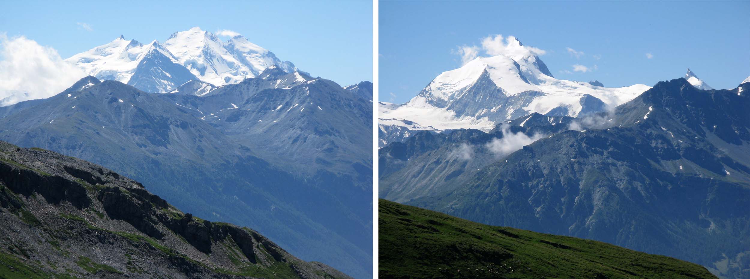 From our trail two of the giants of the Alps were clearly visible south of the Rhone. On the left the Dom 4545 metres, and the third highest peak in the Alps, and on the right, the Weisshorn 4506 metres.