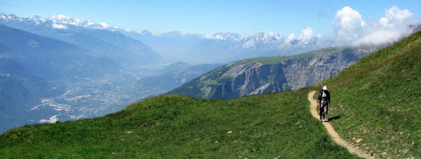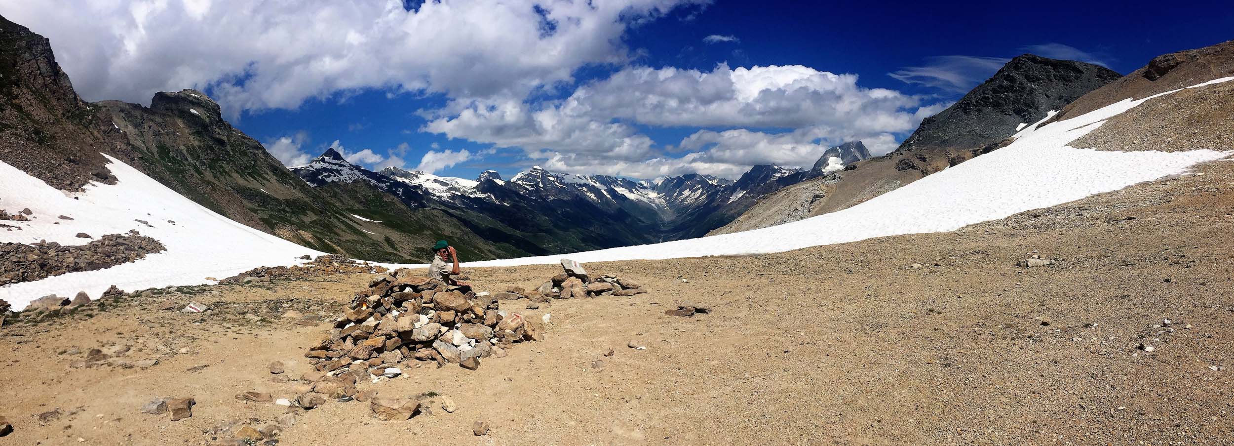 On the trail to Restipass with the Pennine Alps behind south of Rhone Valley below.