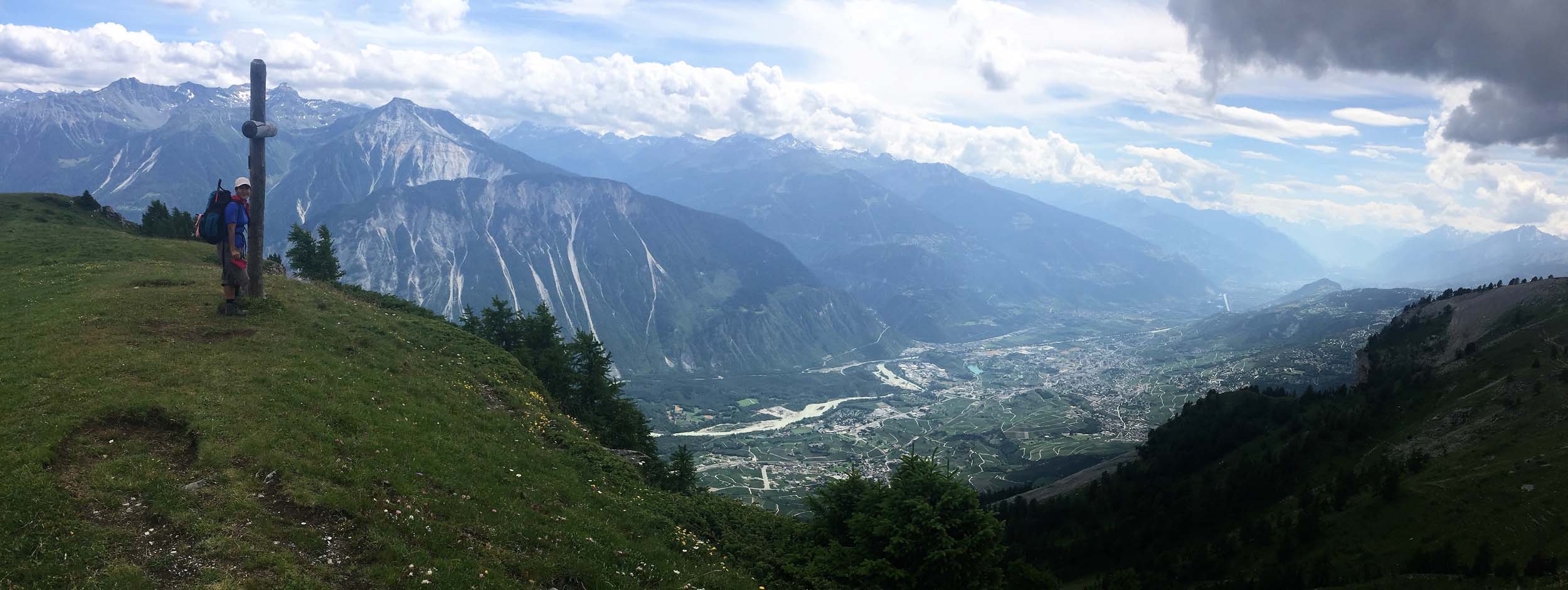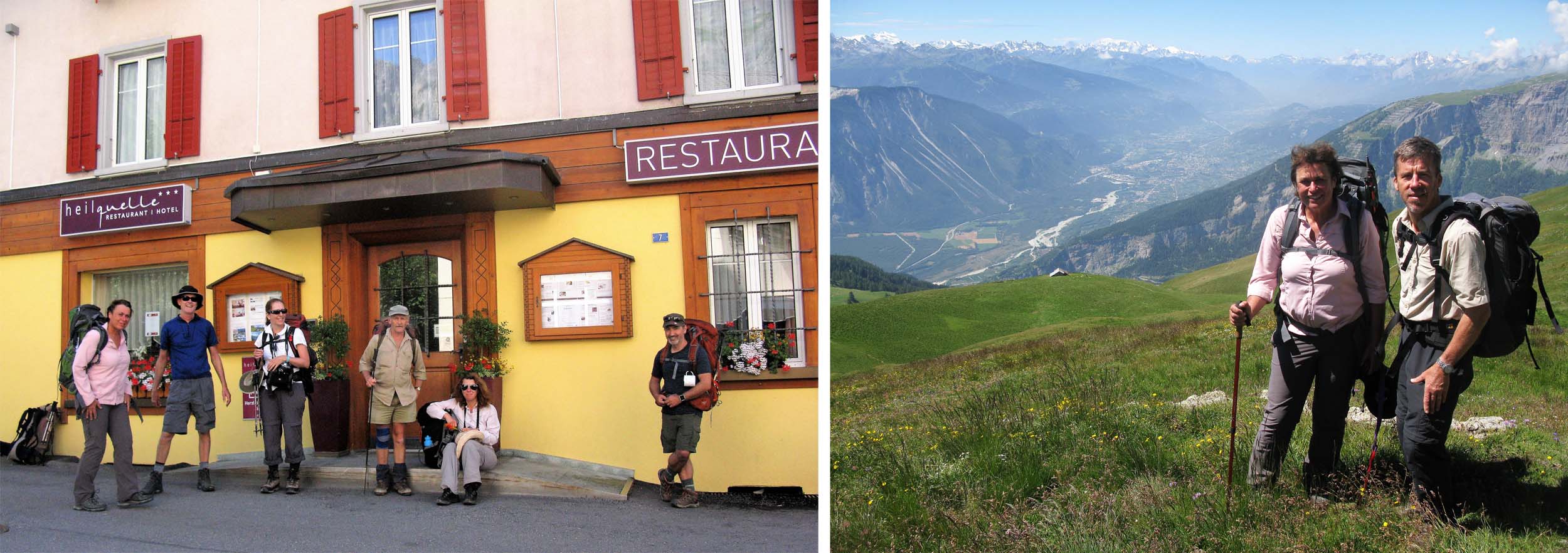 Leaving our hotel in Leukerbad and Group Leader Paul Power and wife Phil on the trail with the Rhone Valley below.