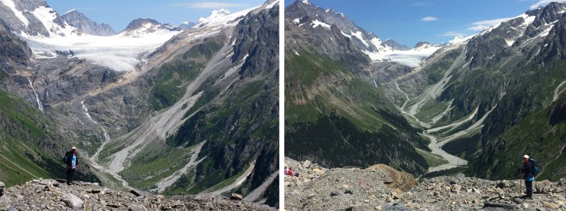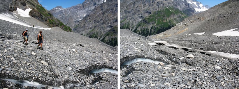 Crossing a dry (no snow cover) glacier is quite safe in good visibility as any crevasses are visible but careful footwork is still required.