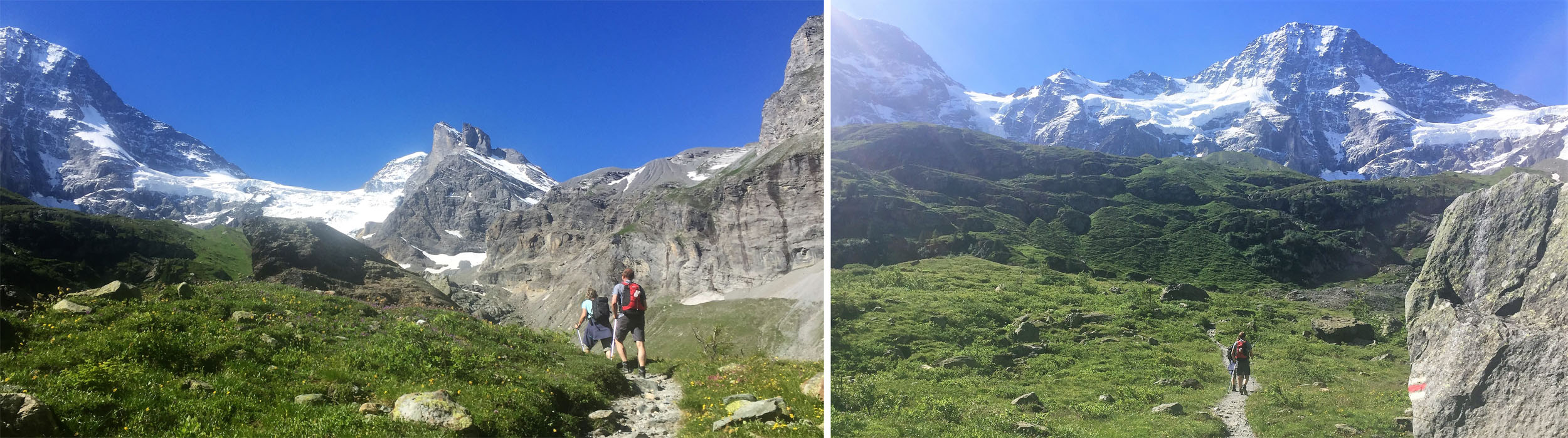 The Weisshorn (Centre) and Zinal Rothorn (right) dominate this view of the trail from the Rinderhutte to the Restipass.