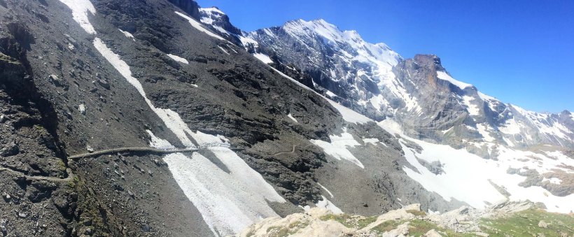 The descent from the Lotschenpass was not without its challenges with one or two exposed (and crowded) sections and a snow slope where I managed to slip and break my walking pole. It is not unusual for the most famous trails in the Alps to be busy on weekends with fine weather.