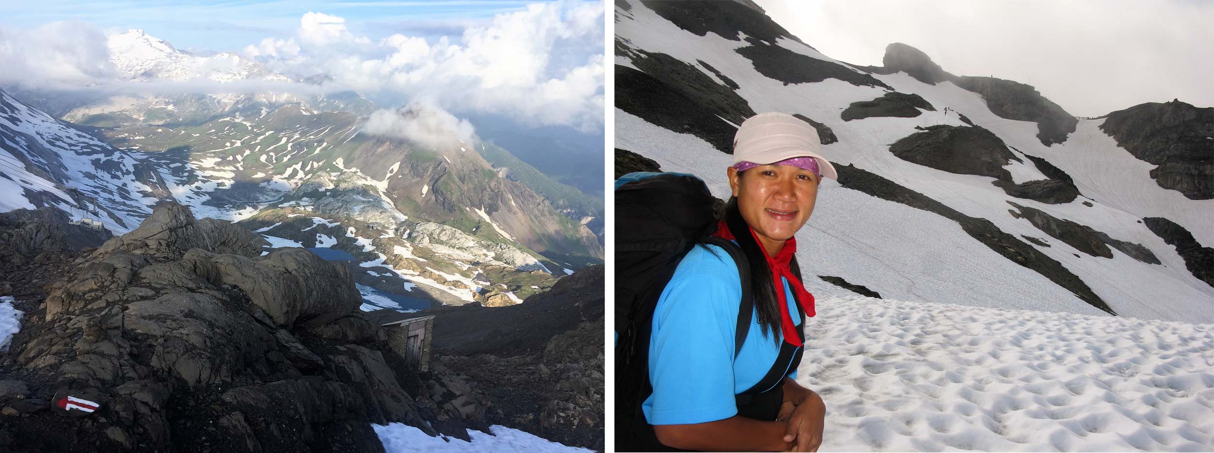 As it was a Saturday there were more than a few hikers coming up from the Kandersteg side so the Pass was quite busy. As I followed the group down at some narrow stretches of the trail where there were fixed chains, I had to wait to let climbing hikers pass and on one steep snow slope I slipped, tumbled down the slope maybe 20 metres and snapped my trusty walking pole, which had survived the previous 15 years with me since I found it on the slopes of Mt Baker in Washington State. Ampai had been watching me from about 300 metres ahead, as she thought I might find that section tricky (She was right!).