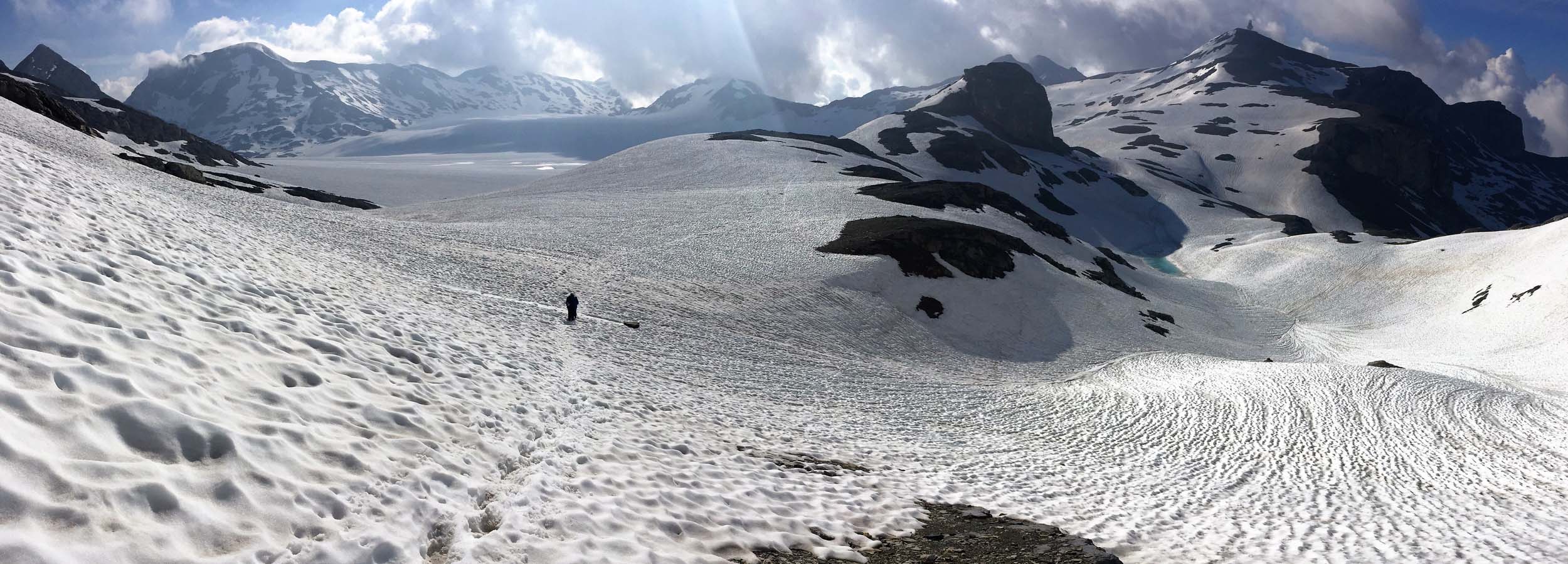 Heading towards the Plaine Morte Glacier. Our route goes to the tower on the summit far right.