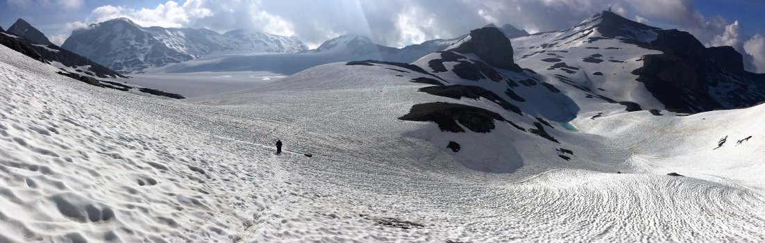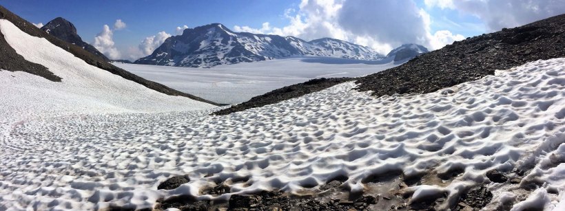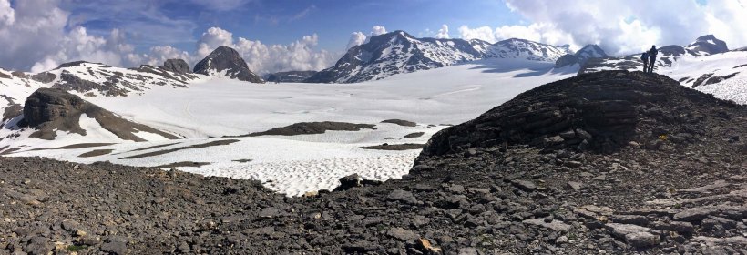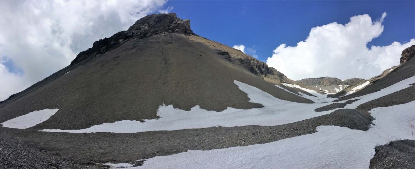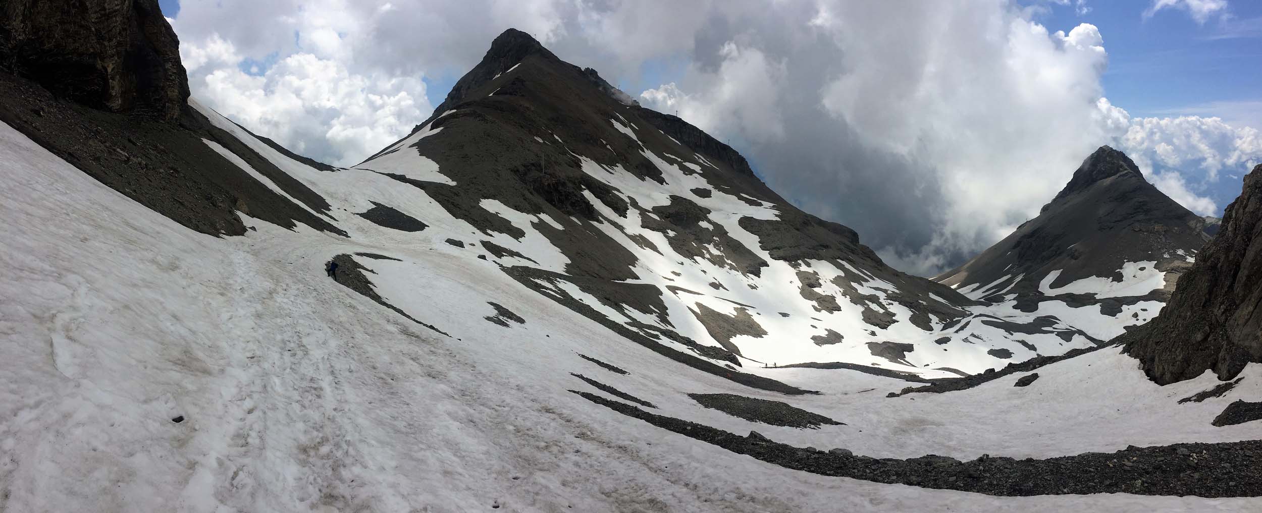 The Plaine Morte Glacier is like a small ice field and the Wildstrubel is the central peak beyond the icefield.