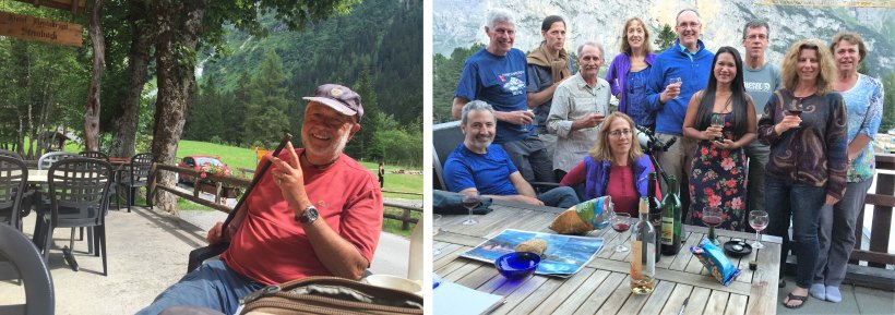 Our group on the summit of Tanzbodoli and enjoying dinner at the Obersteinberg Mountain Inn.