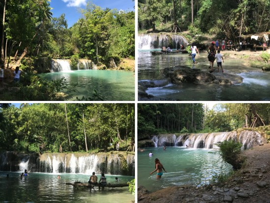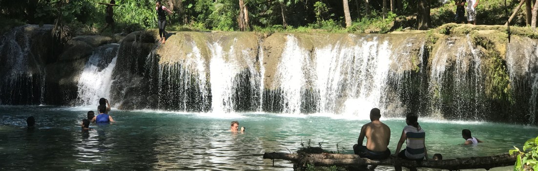 After Lazi we drove north for a few kilometres to the Cambugahay Falls where we walked down a rough stairway to a series of swimming holes. Jen kept us entertained by swinging back and forth on a rope suspended from a branch overhanging a swimming area before dropping into the pool below whilst I…………………….watched and took photos! Local kids escorted us down the steps to the pools and back up again afterwards.