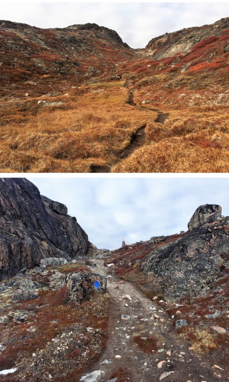The trail continued up perhaps 50m in ascent to a narrow col between higher rocks on either side. This was the first time I could recollect following a ravine to cross a ridge and I had clearly reached the point where Steve had turned as  I could now see the town of Ilulissat below me.