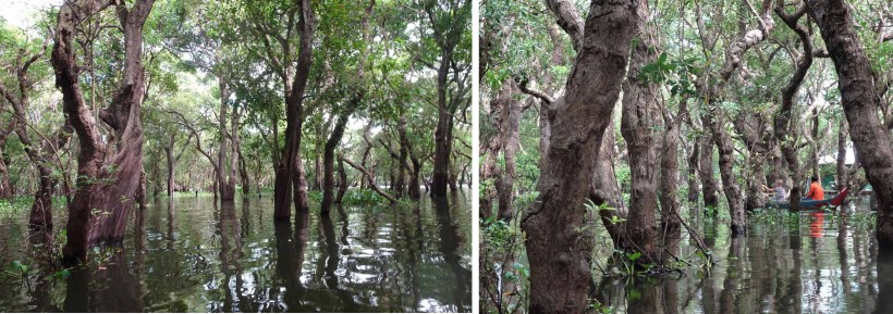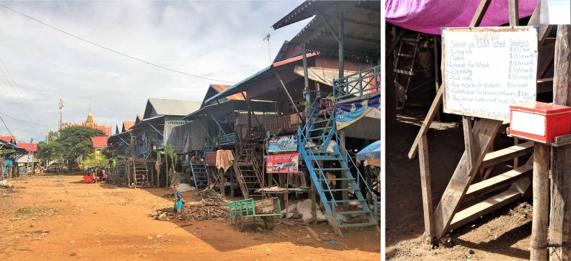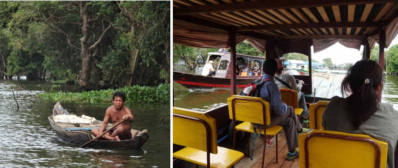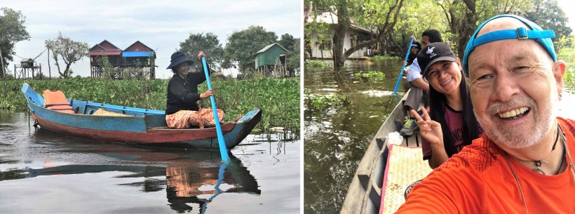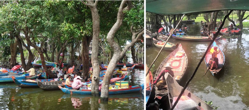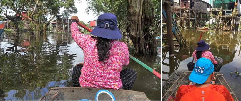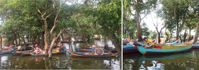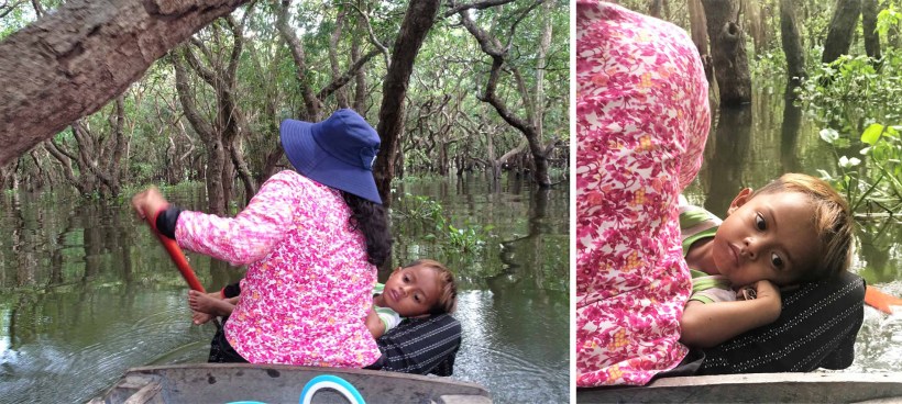 So I checked the Travel app ‘Viator’ on my phone which lists many local attractions and found a half day excursion to Tonle Sap, which included being picked up at our hotel in a minibus, transferred with a local guide to the river, a private boat which stopped so we could explore the village of Kampong Phluk which is normally built on the water but as the water levels were low we could walk amidst the houses all constructed on stilts, an exploration of the Mangrove forests in a smaller canoe vessel powered by a multi tasking local woman who minded her baby as she skillfully navigated amidst the waterlogged trees and roots (everyone is allocated work by rotation so all families benefit from the tourism) and eventually, after transferring back to our ‘bigger’ boat, we reached the lake itself where surprise surprise we were met by floating shops selling drinks and snacks.