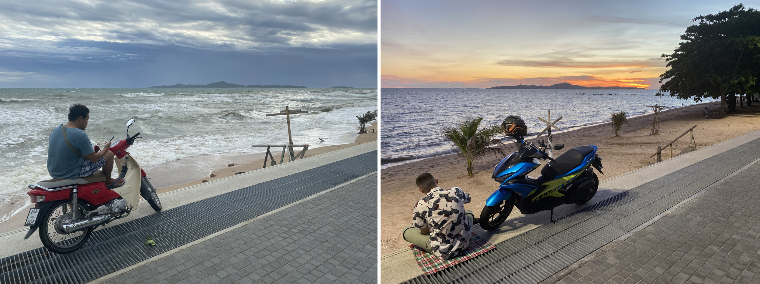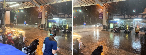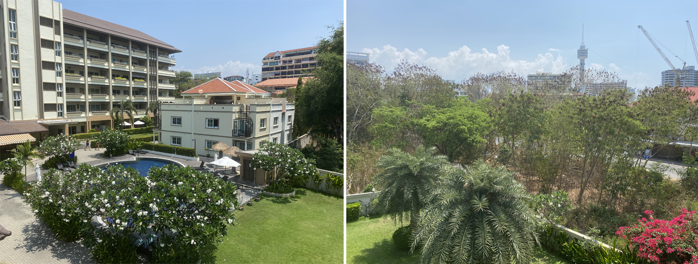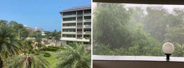 Left: Looking towards the Asia Pattaya Hotel which was the first hotel in the Pattaya area. Now there are thousands! Right: Heavy rain always makes me thankful for the roof above my patio!