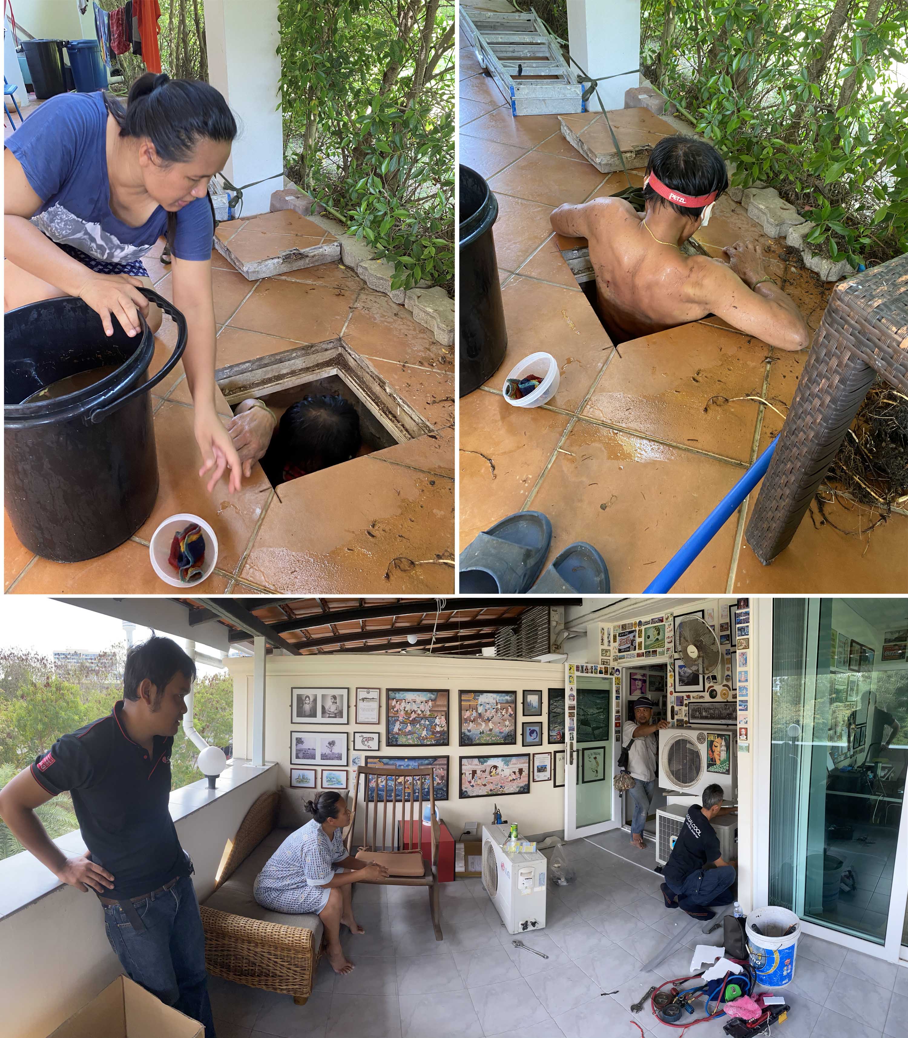 Ongoing maintenance at Mayfair Mews replacing an a/c unit and repairing the water tank. Yes the condo gardener squeezed through the manhole!