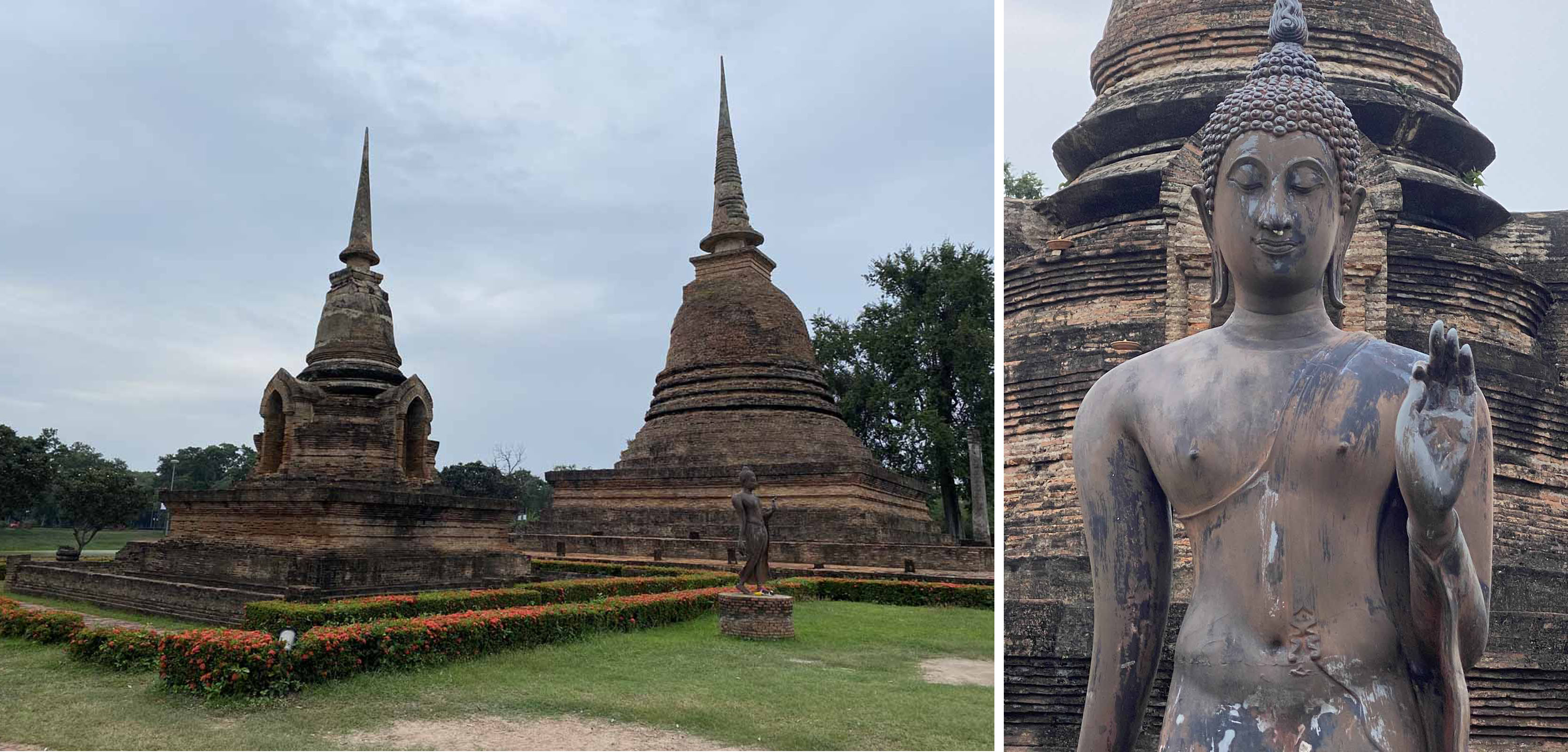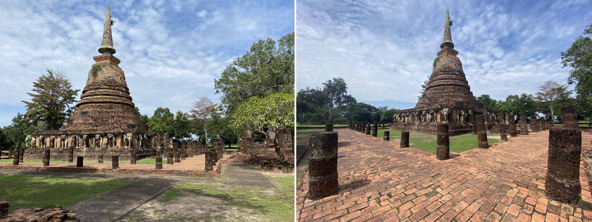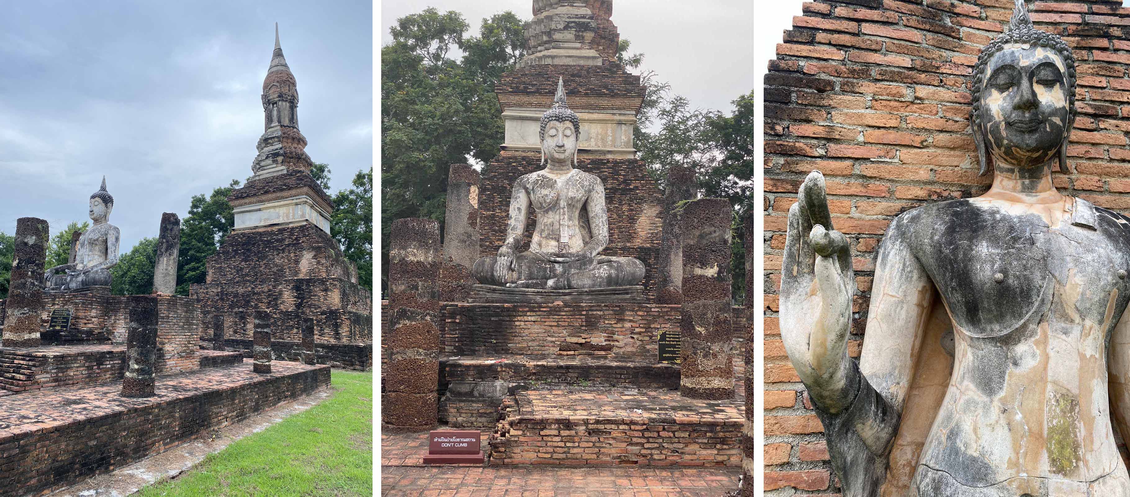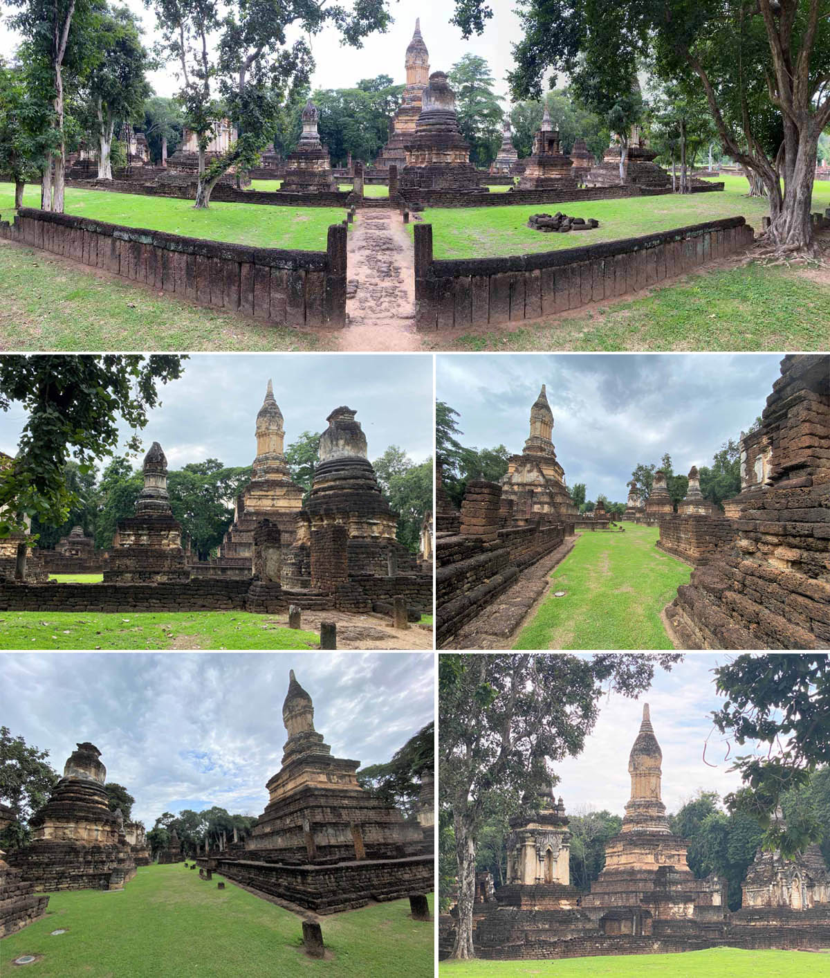 There are over 40 restored Temple compounds ranging from little more than outline foundations to an extensive complex in the forested northern zone about a mile from the centre. These include a giant standing Buddha at Wat Phra Si Iriyabot and the elephant buttressed Wat Chang (Elephant) Rawp.