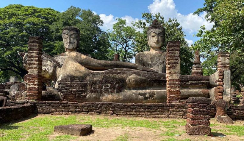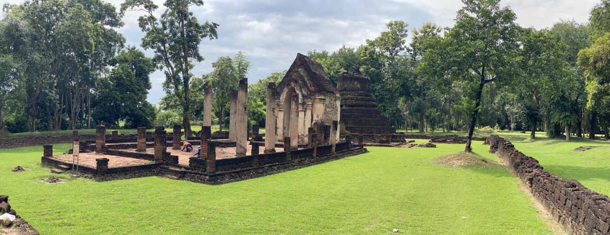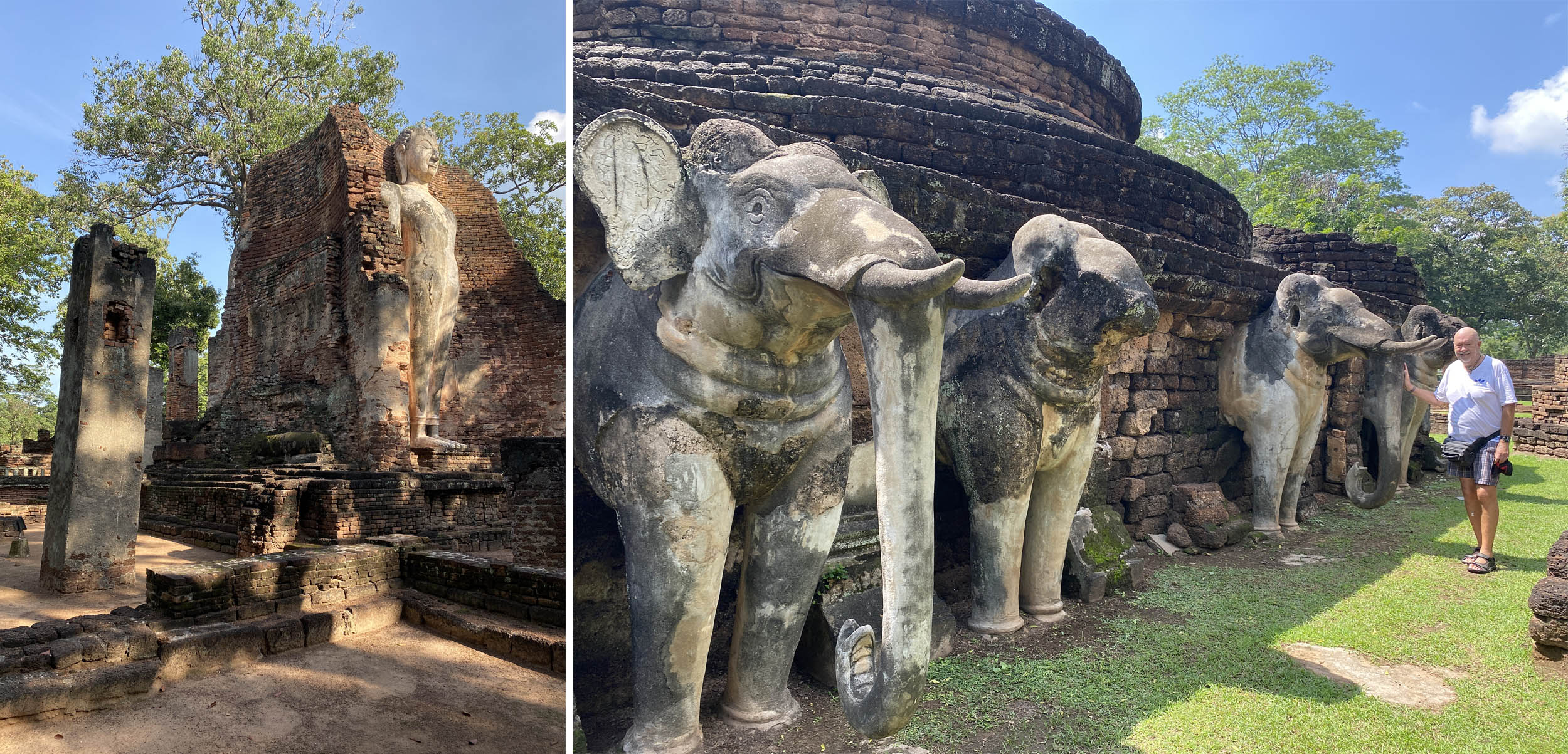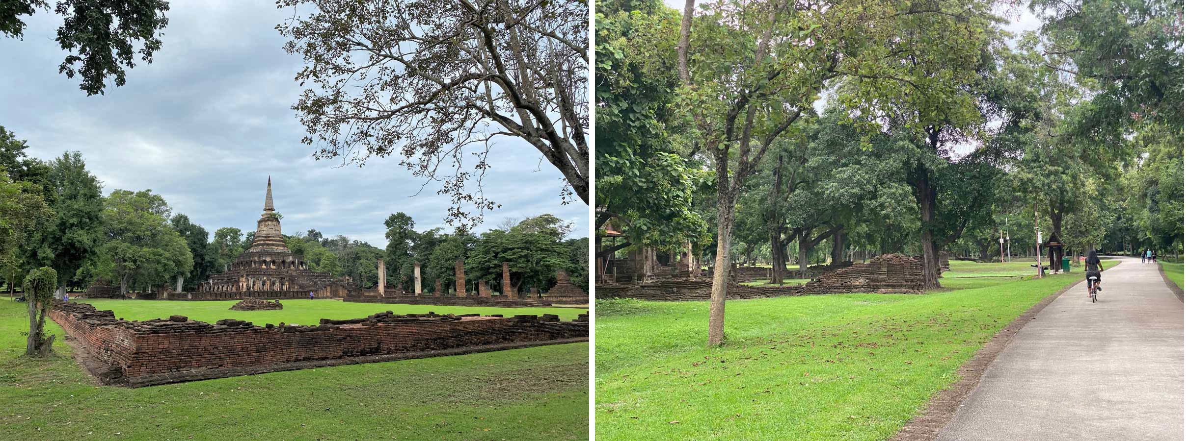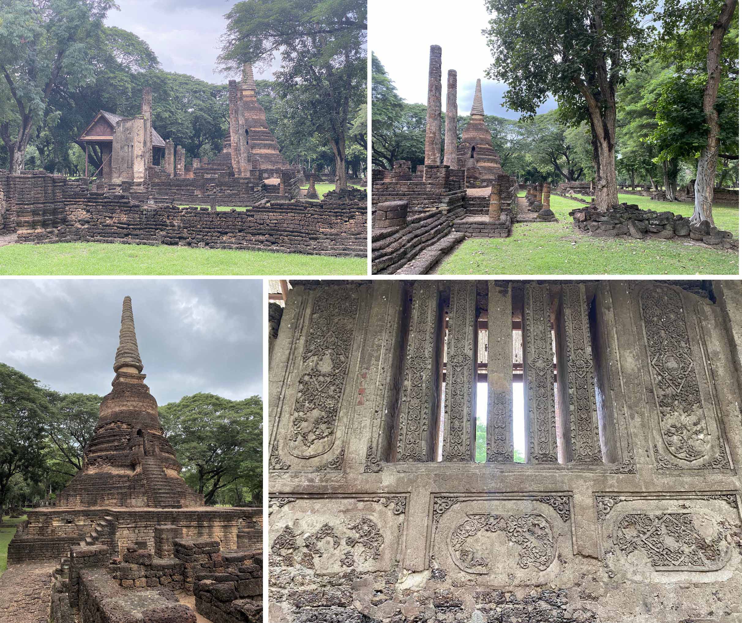 There are over 40 restored Temple compounds ranging from little more than outline foundations to an extensive complex in the forested northern zone about a mile from the centre. These include a giant standing Buddha at Wat Phra Si Iriyabot and the elephant buttressed Wat Chang (Elephant) Rawp.