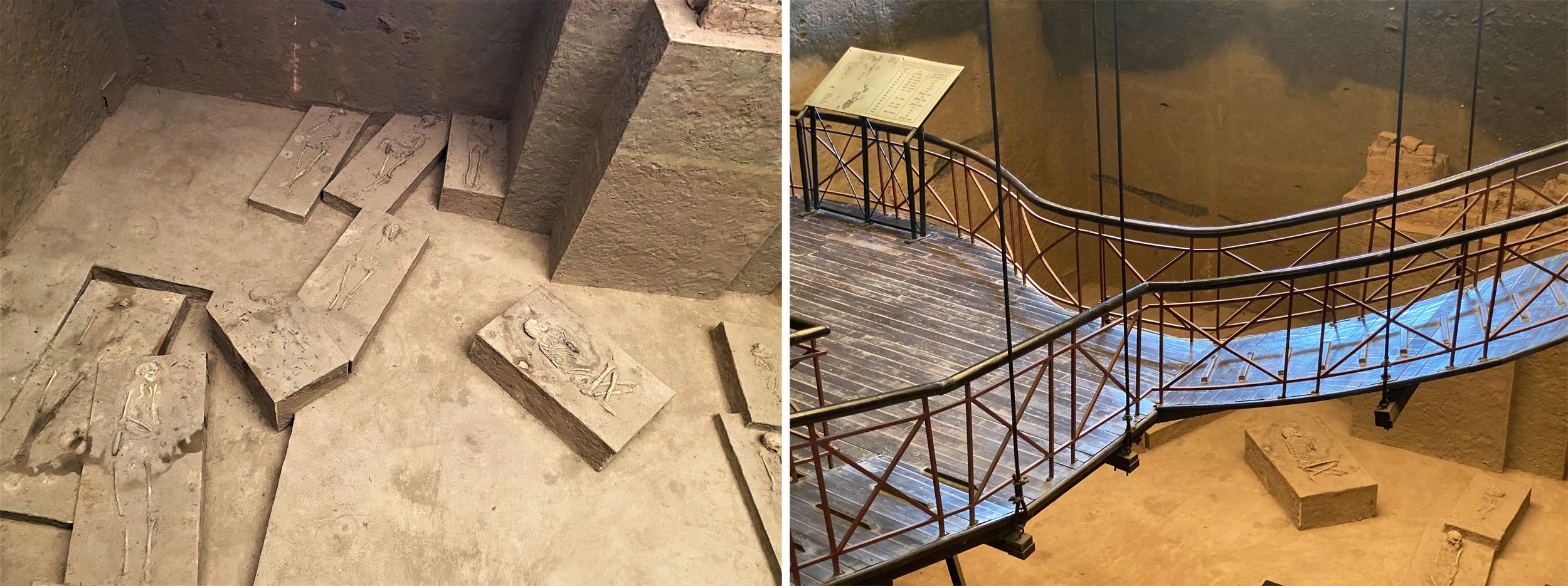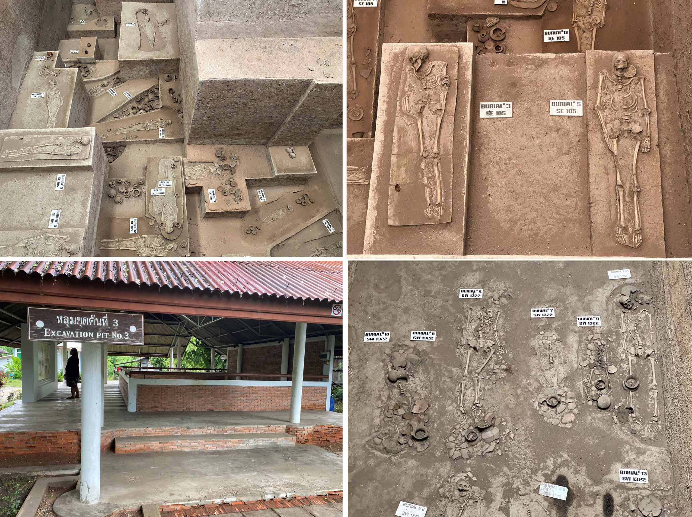 The skeletons at the Wat Chom Chuen archeological site can be viewed from a footbridge built within a protective pavilion.
