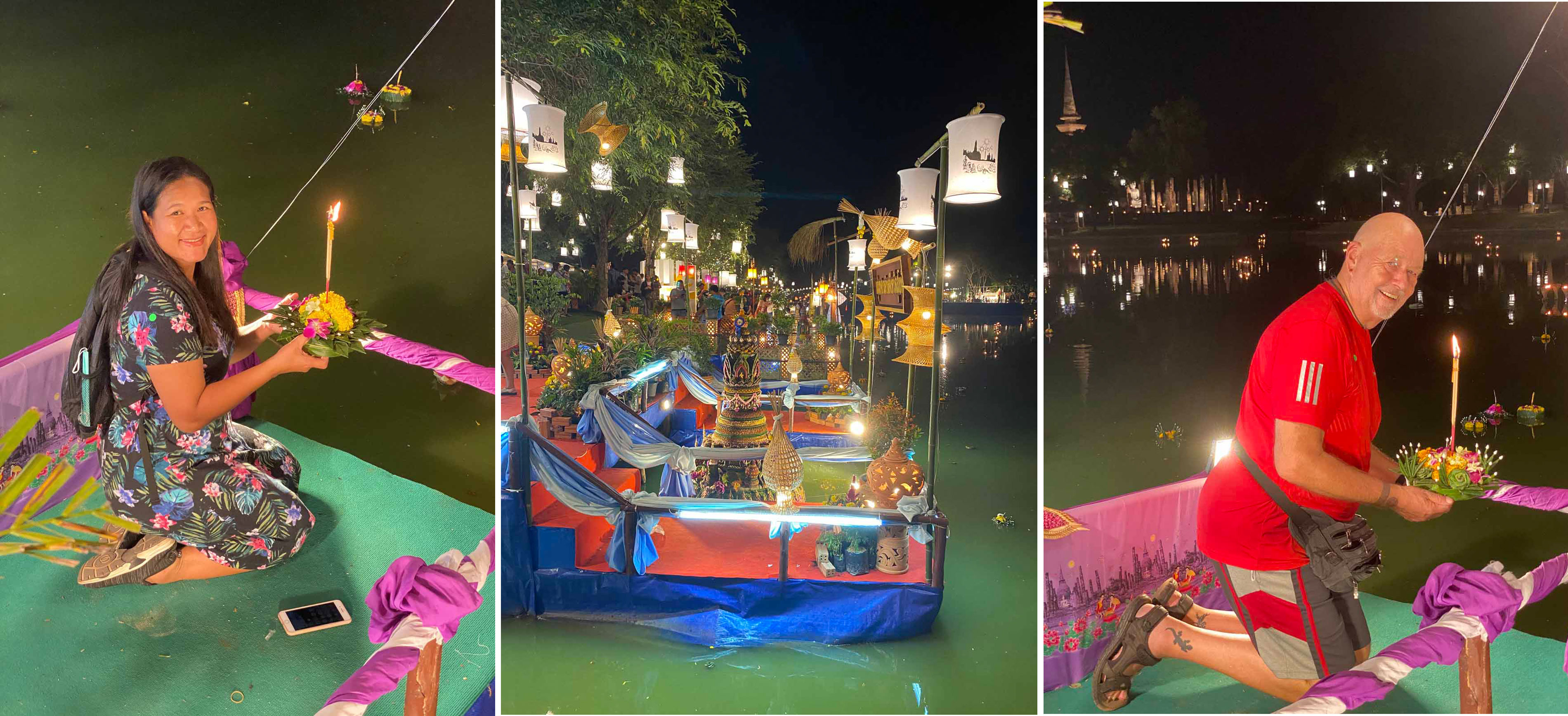 Other than Thai New Year, Loy Krathong is Thailand’s most important annual celebration. As the tradition of celebrating Loy Krathong originated in Sukothai there is no better place to watch the celebrations, which are considered to be the finest in Thailand. For five days every November the historic park makes a spectacular setting with fireworks, folk dance performances, sound and light productions, all set amidst the temples and of course with the magical floating lanterns on the ponds and canals. Thais believe that the light of the candle shows respect to Buddha and the floating away of the Krathong on water is symbolic of letting go of one’s hatred, anger, sins, worries and bad luck. We were fortunate to be in Sukothai for Loy Krathong and at night the park was transformed into a colourful circus of eating, shopping and entertainment with thousands of ornate krathongs made of flowers being purchased to float away on the water.