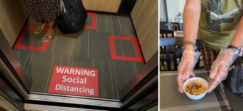 Thailand is very Covid – 19 conscious. Plastic gloves at buffet breakfast and social distancing instructions in the lifts.