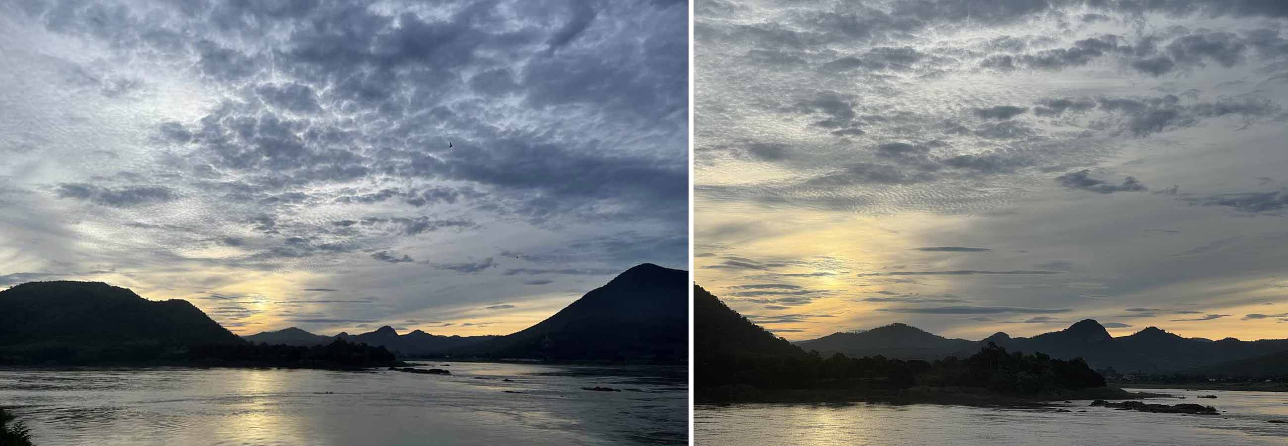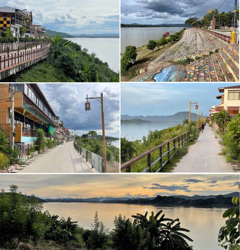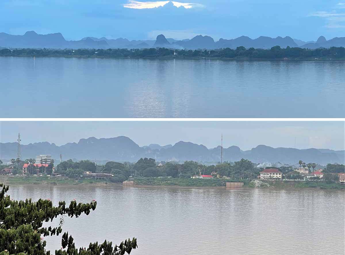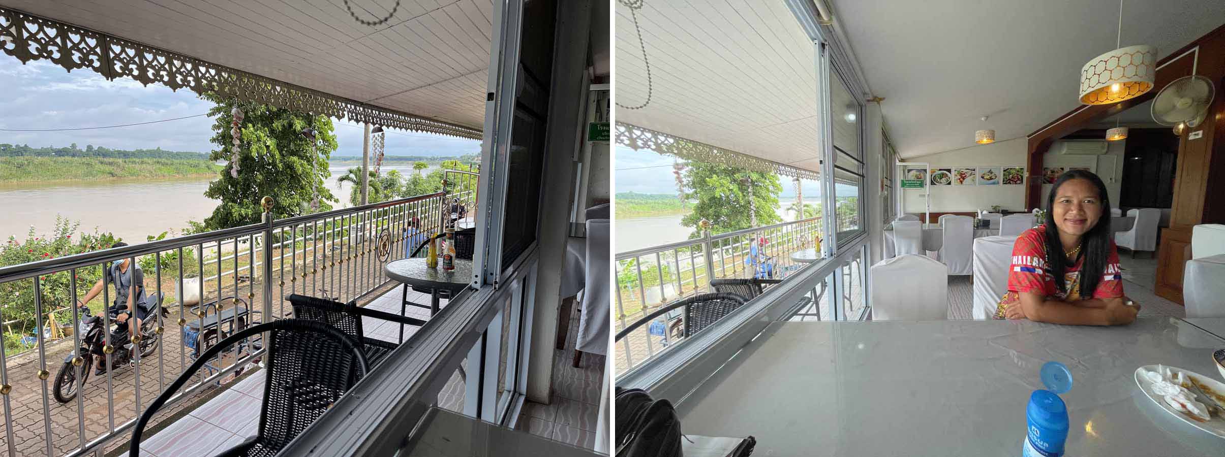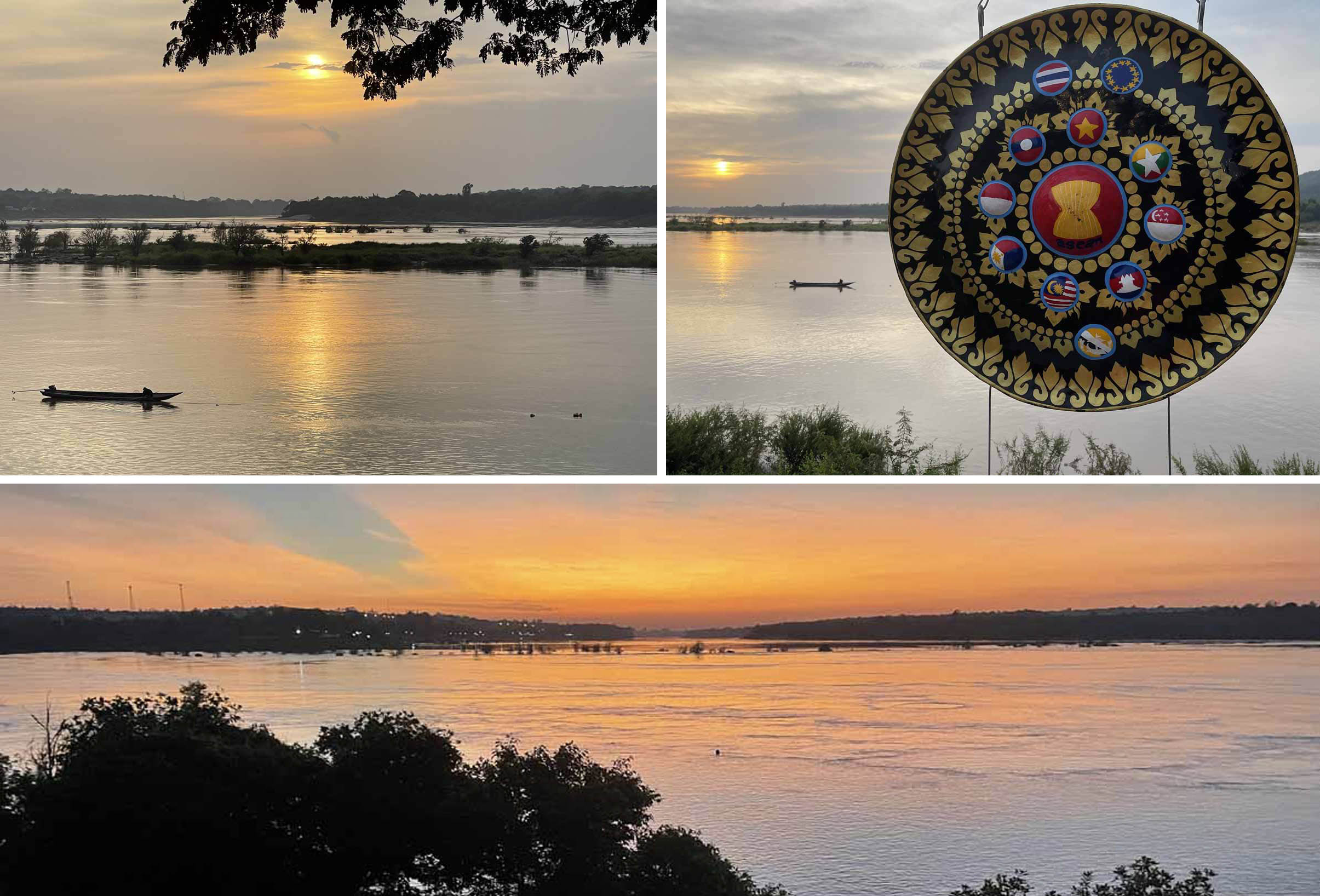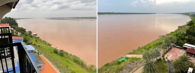 Views of the dramatically shaped limestone mountains across the Mekong in Laos dominate the views from the riverfront.
