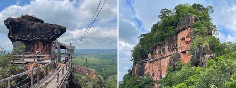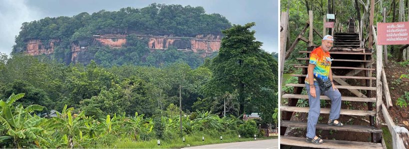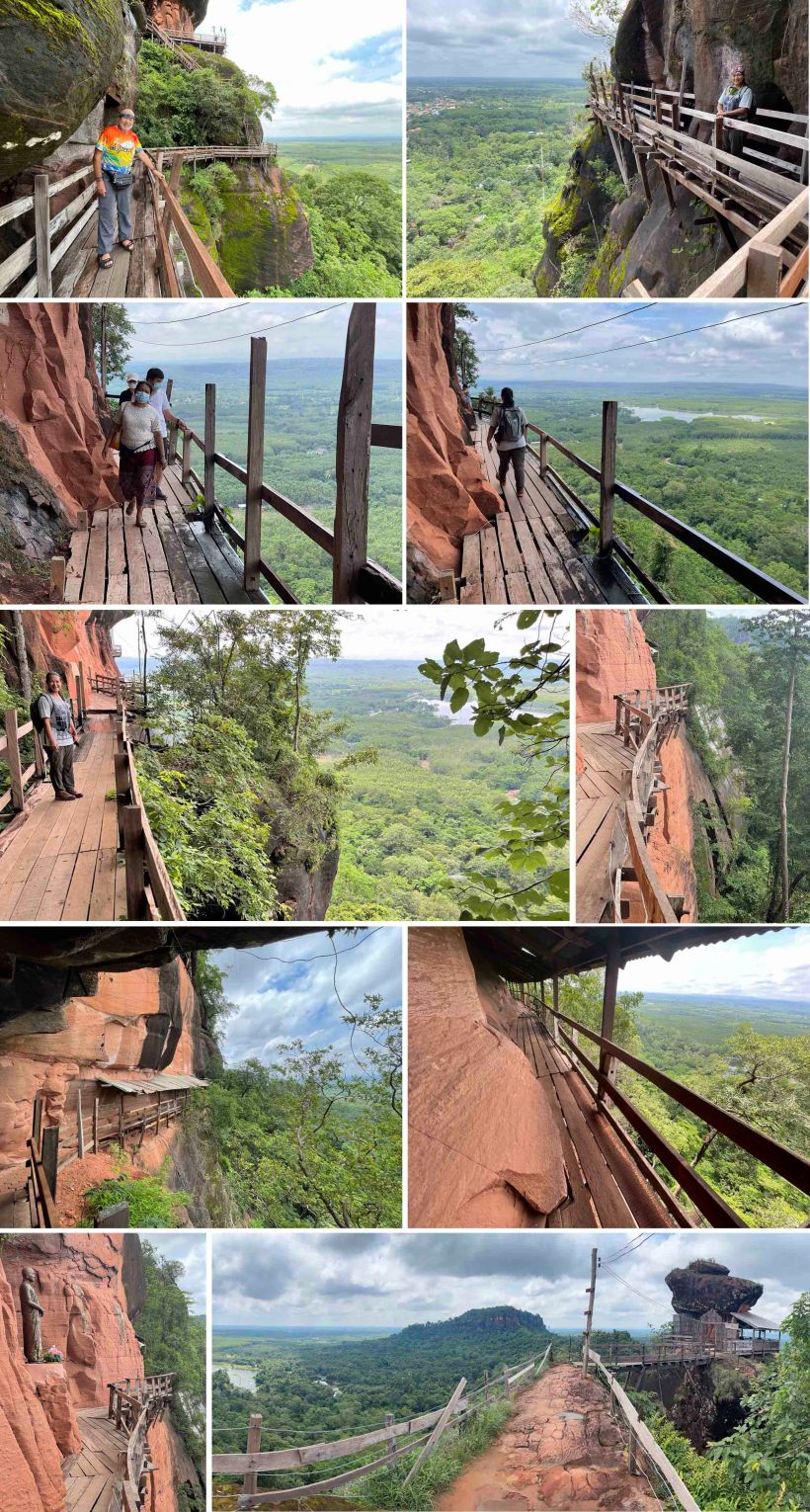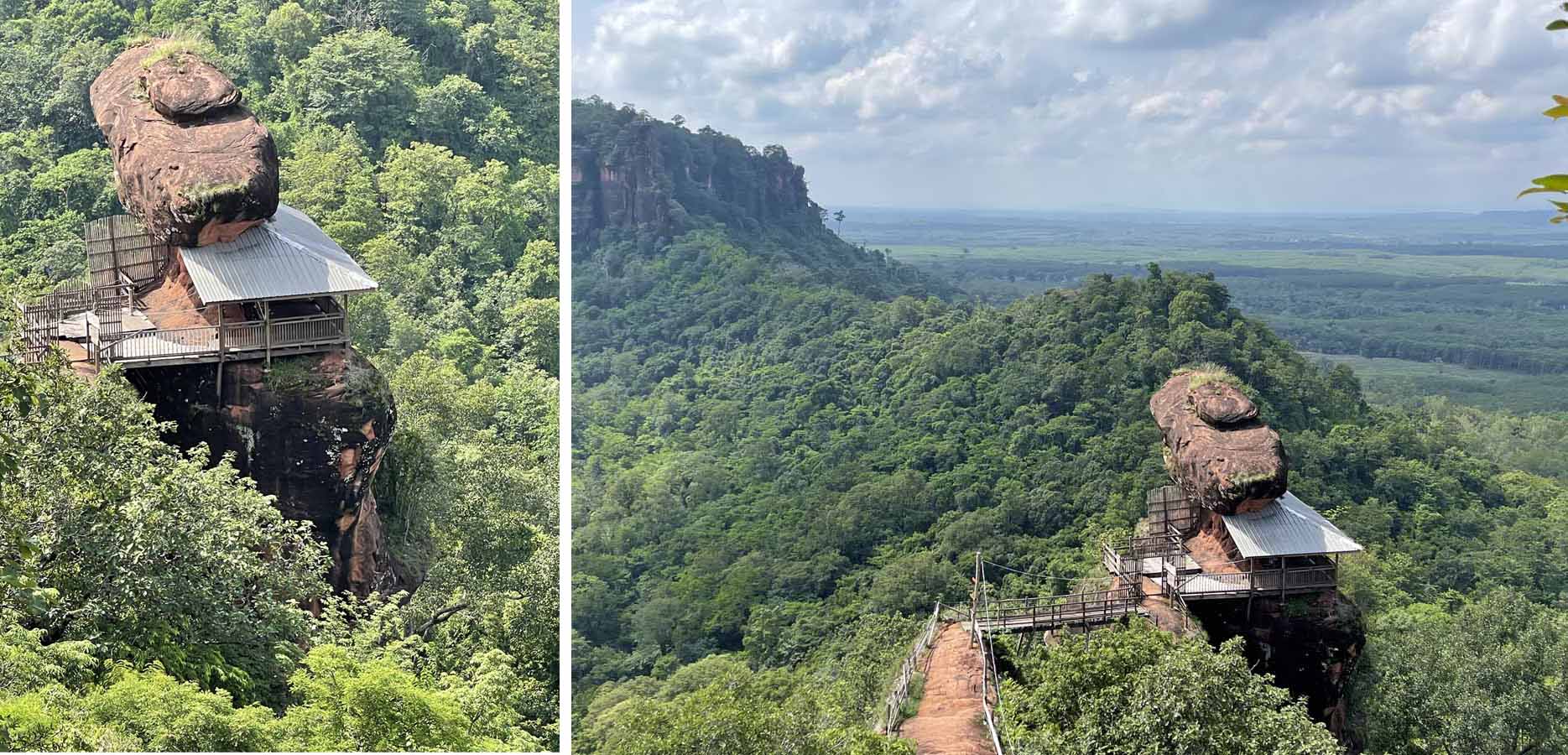 The walkways clinging to the sheer walls of the isolated sandstone outcrop at Phu Tok are clearly visible.