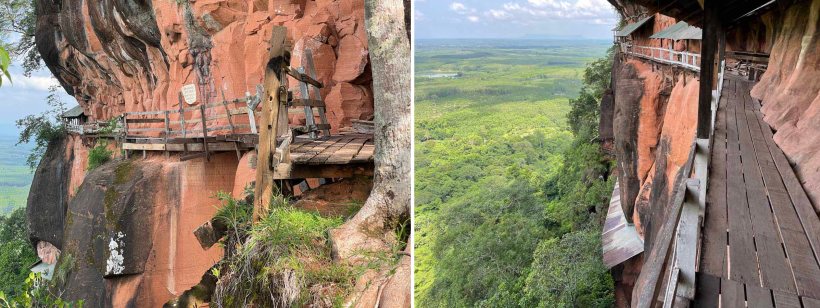 Phu Tok is one of the outstanding attractions of Northeastern Thailand and quite unlike any other temple complex in Thailand, due to its unique location. A series of what look to be precarious wooden walkways, platforms and rickety staircases are somehow attached to a large and isolated sandstone outcrop and provide outstanding vistas. The complex was built by a famous meditation Monk Ajahn Juan who subsequently died in a plane crash and his remains are enshrined in the grounds at the foot of the outcrop. Some of the caves and niches alongside the walkways are now adorned with shrines.
