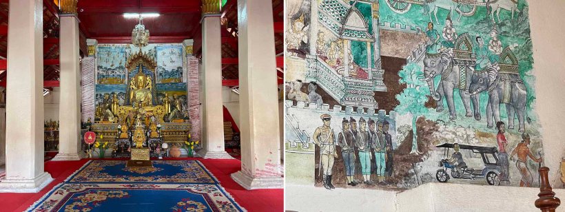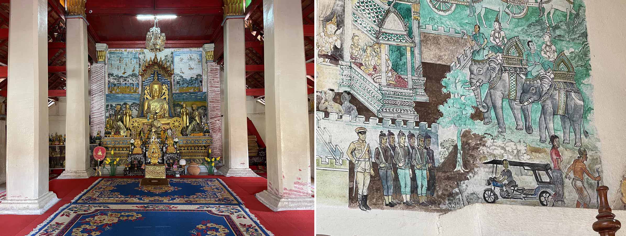 The original temple has a new roof and faded ancient wall murals on the exterior. The large seated Buddha in the interior is considered Chiang Khan’s most sacred image.