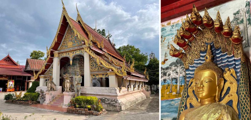 A magnificent hood with nine serpents adorns the Buddha that is the focal point of Wat Sri Khun Mueng.