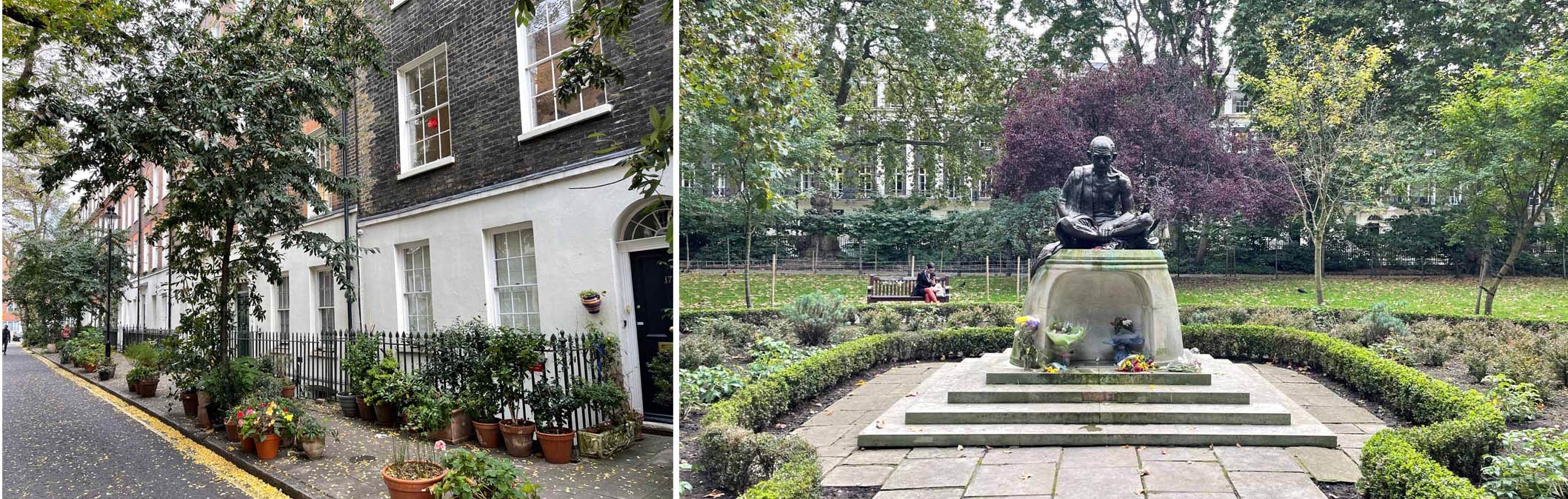 Being based in Bloomsbury means there are plenty of quiet streets and greenspaces. The statue of Ghandi is in Tavistock Square.