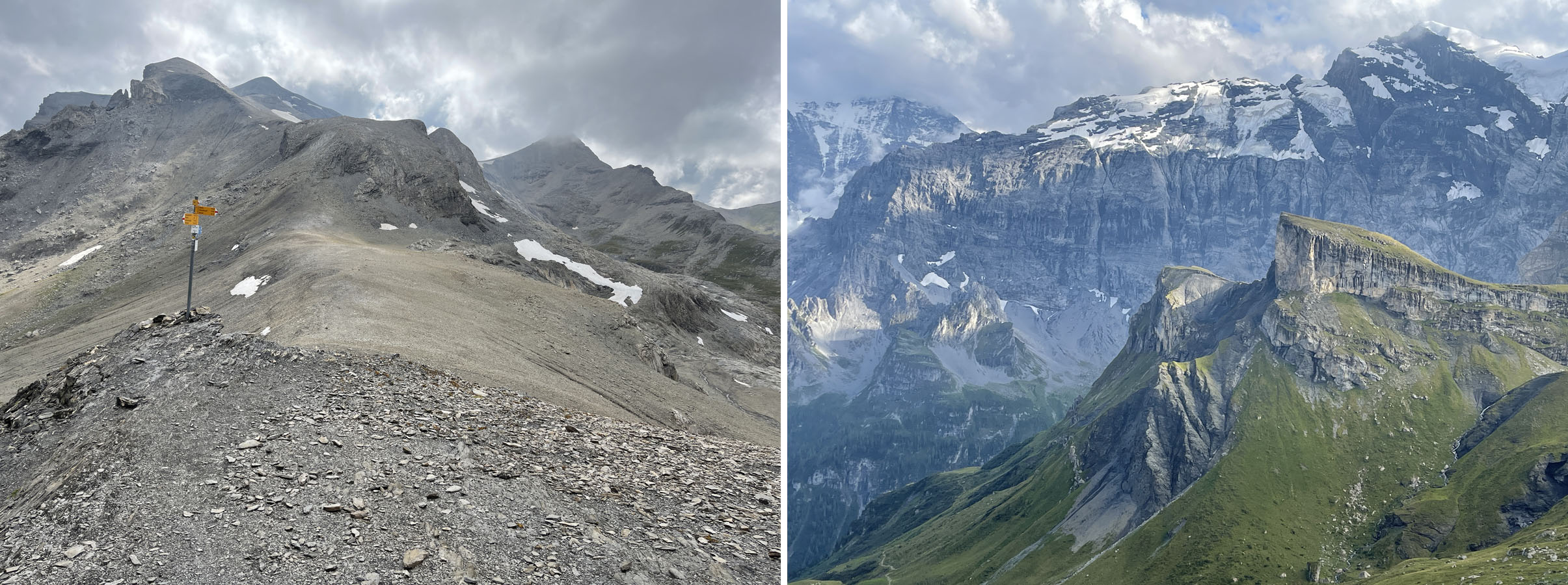 The Grosshorn and graceful Breithorn overlook the sloping plateau of Tanzbödeli, a popular but challenging hiking destination (Right).