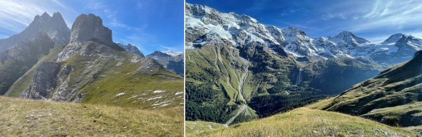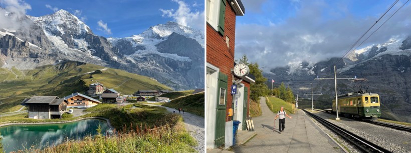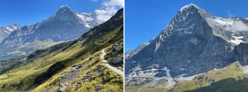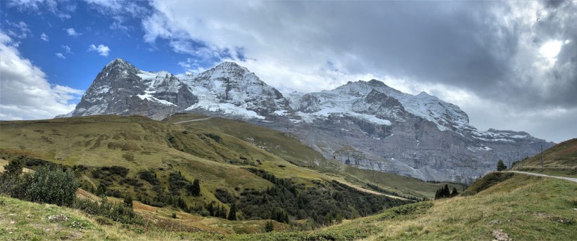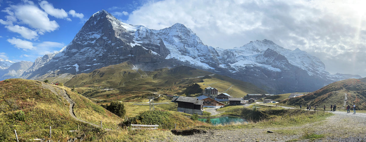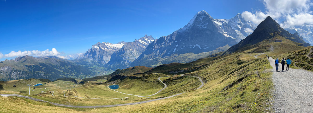 The easy and level walk from Männlichen to Kleine Scheidegg is the first walk I ever made in the Alps and affords fine views of the village of Grindelwald, the Wetterhorn and the imposing Eiger ahead.