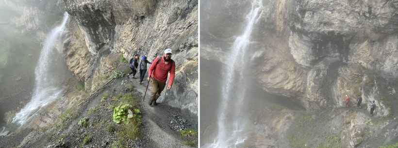 The smaller village of Gimmelwald is an active farming community and a 30 minute walk below Mürren, or 5 minutes via the twice hourly cable car. As a result of being recommended by the famous travel writer Rick Steves almost 30 years ago, it has attracted many budget travellers and a number of local families offer dormitory and bed and breakfast accommodation. The Sprutz Waterfall, easily accessible from both Mürren and Gimmelwald, is distinguished by the ability of visiting hikers to be able to walk behind the waterfall.