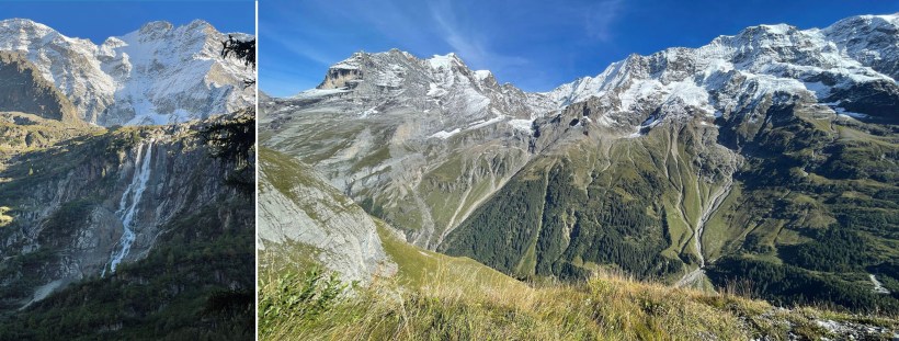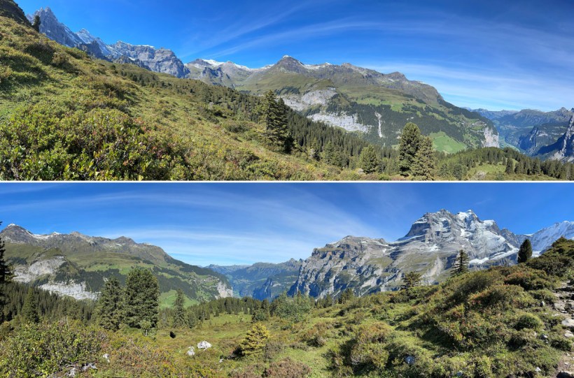 There are fine views of the Mönch at the head of the Trümmelbach Valley and the Jungfrau from Preech.