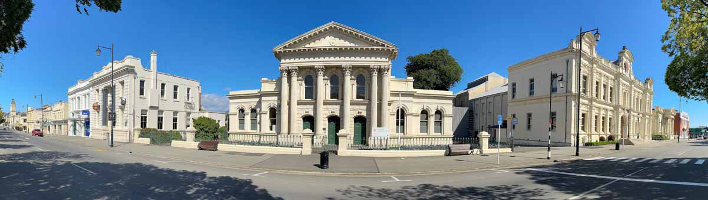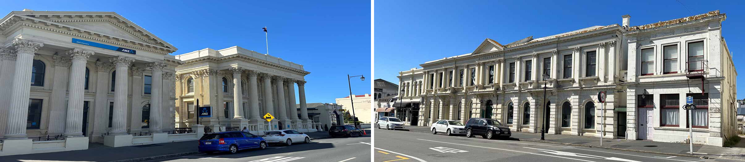 The imposing ANZ Bank and Forrester Gallery (formerly Bank of NSW) are both adorned with Corinthian columns.